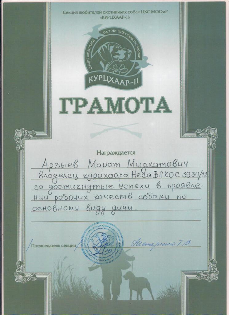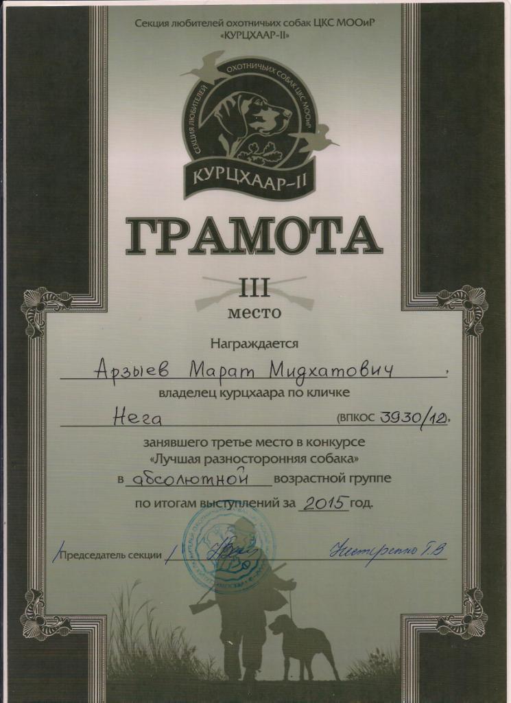 Отцу щенков, Зов Полей Светозар, занявшему 1 место в личном первенстве с дипломом второй степени, при 82-х балах, на Московских открытых внутрипородных состязаний курцхааров по болотной и полевой дичи 21-22 мая 2016г присуждено звание " Полевой Победитель".