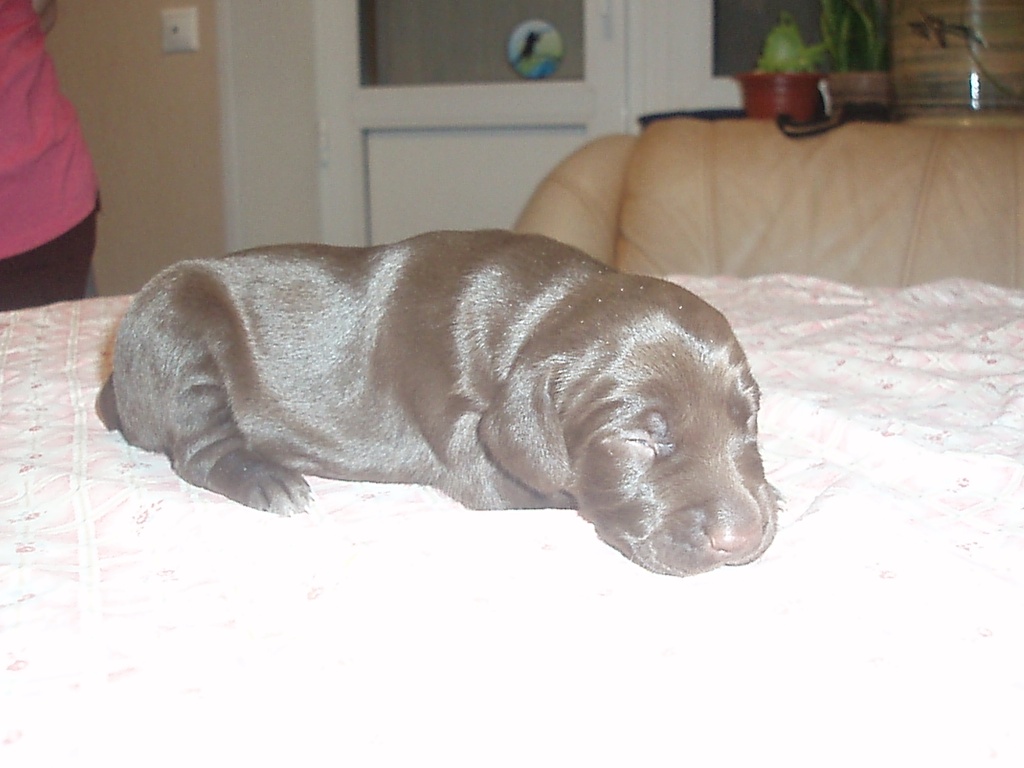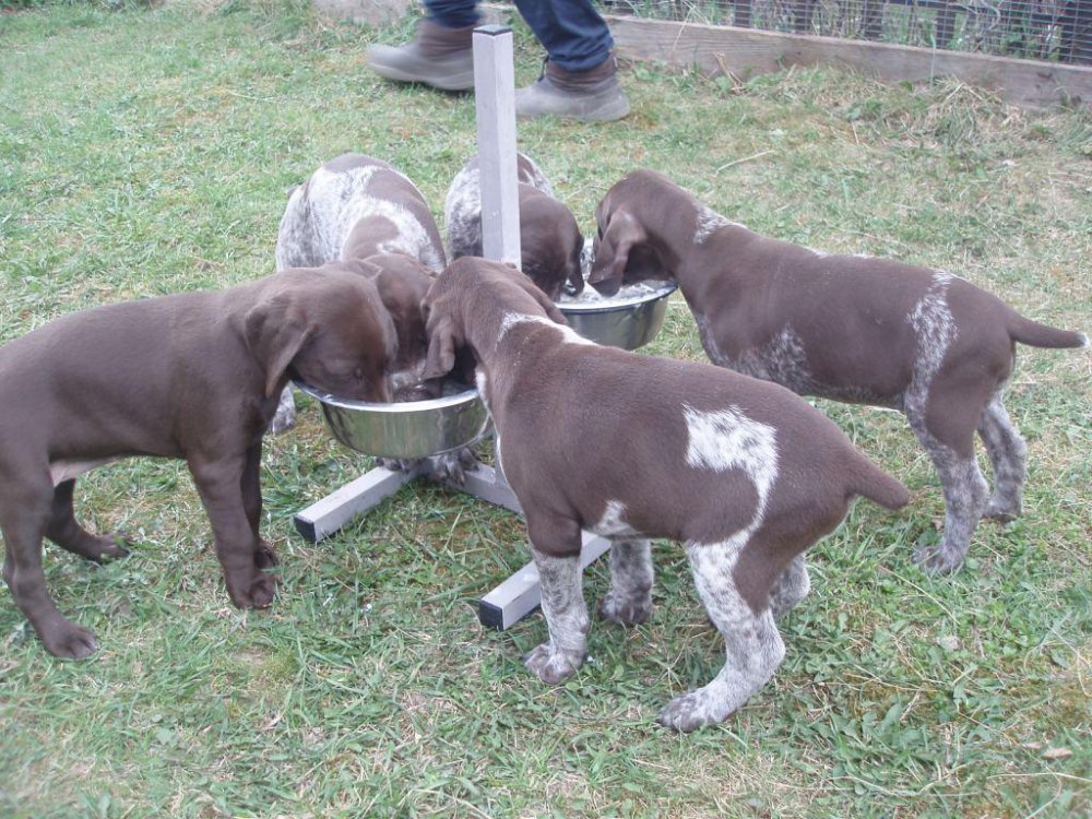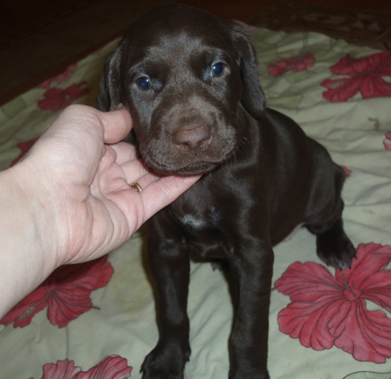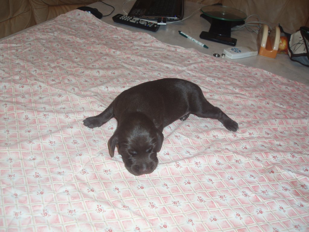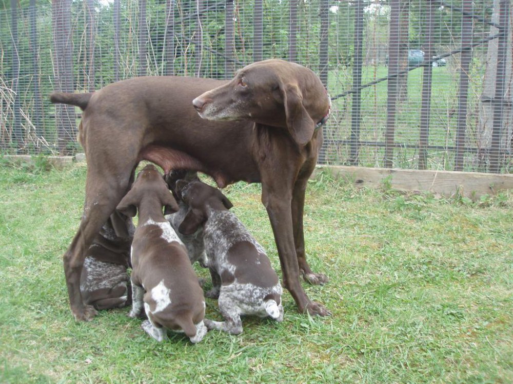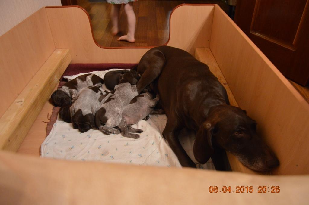 В помете 6 щенков: 2 кобеля (кофейный и кофейный в крапе) и 4 суки (1 кофейная и 3 кофейные в крапе).