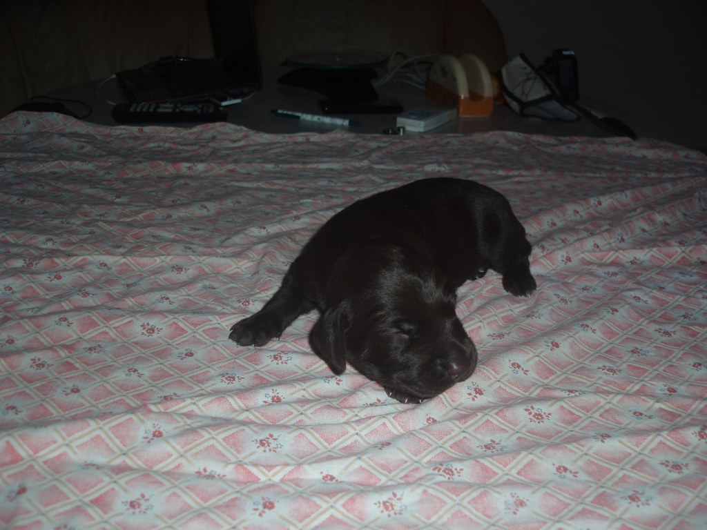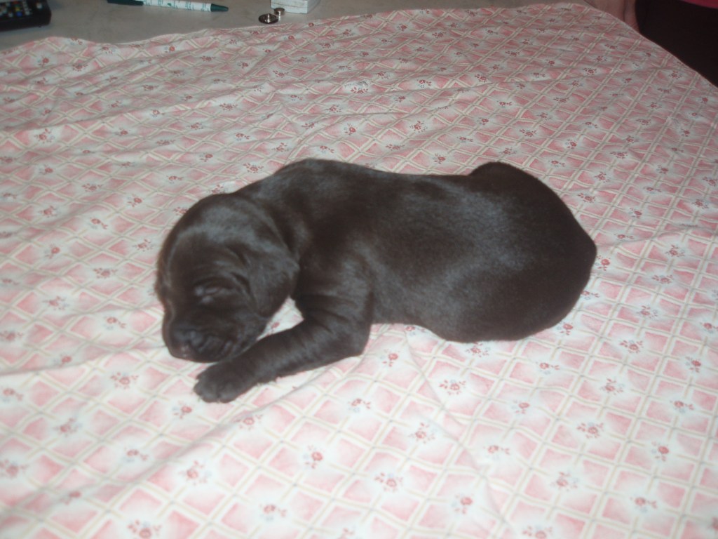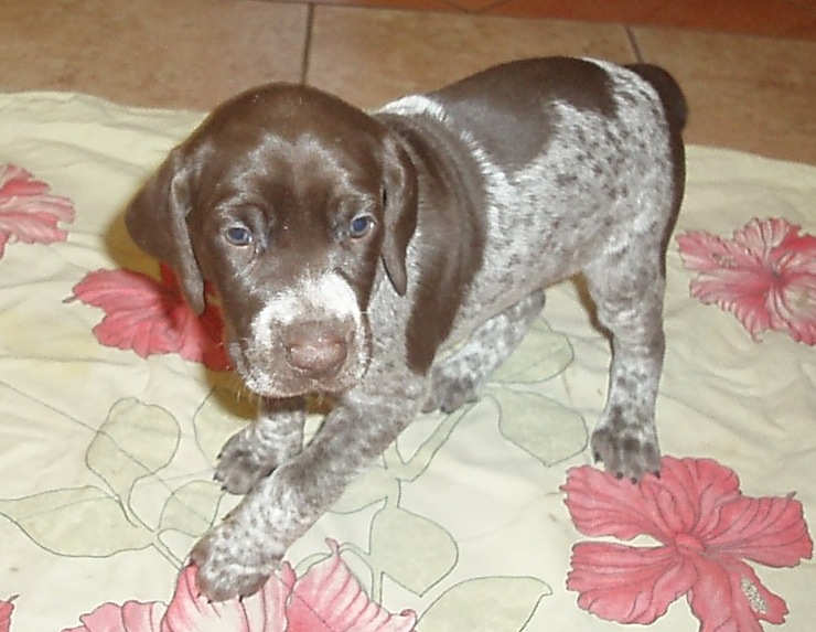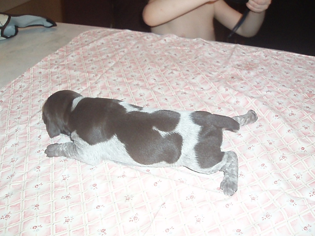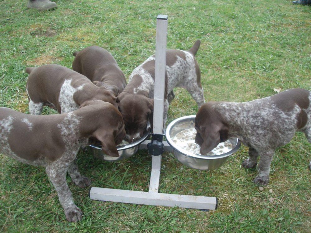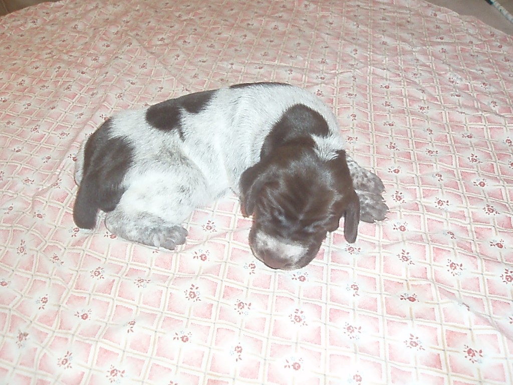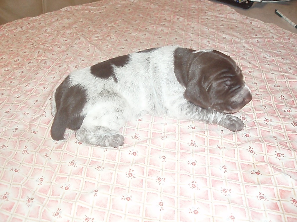 В помете 6 щенков: 2 кобеля (кофейный и кофейный в крапе) и 4 суки (1 кофейная и 3 кофейные в крапе).