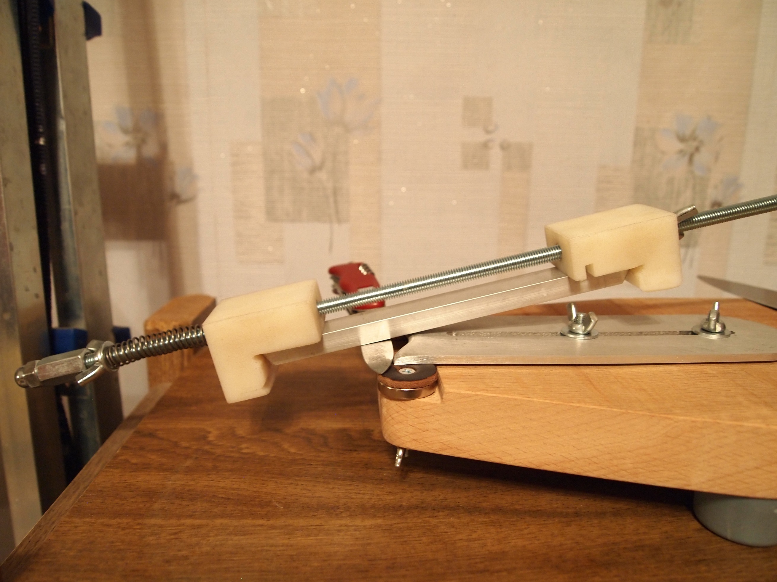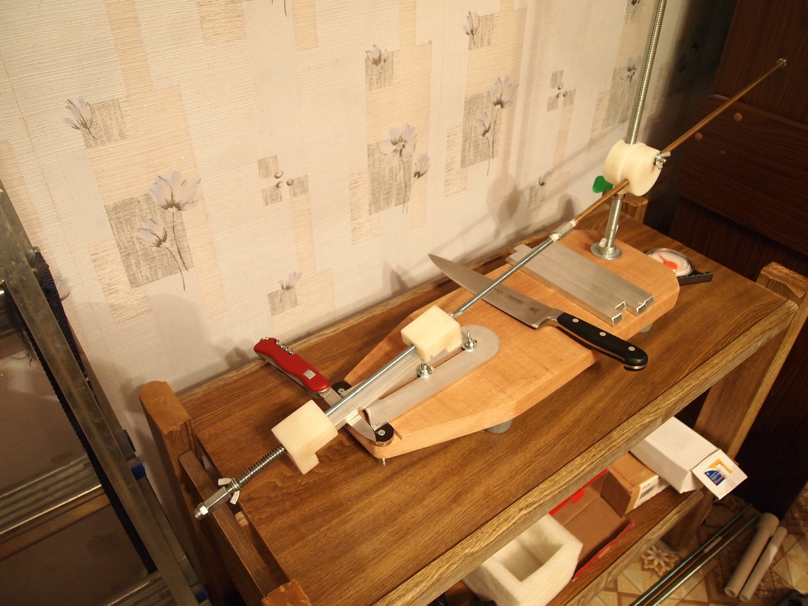 Интересная штука Имел опыт с заточкой на устройстве Ganzo. Оно хоть и боле аккуратное, но и не такое массивное - это выглядит устойчивей. Вот только смущает меня отсутствие нормальных абразивных камней (http://ru.aliexpress.com/item/Free-...al-Sharpening-System-H0816F1/32263640662.html). Подобный наборчик здорово поднял бы покупательскую способность вашего устройства (по крайней мере нужна инфа подойдет ли он). Жаль у меня нет гаража или просто свободного места под такую штуку... Хотя если вы в довесок подарите мне гараж - куплю даже за двойную цену))))) Точить действительно на такой штуке удобно, достаточно почитать/посмотреть ролики на ютубе (точилка АПЕКС) и потренироваться на обычном кухонном ноже перу раз.