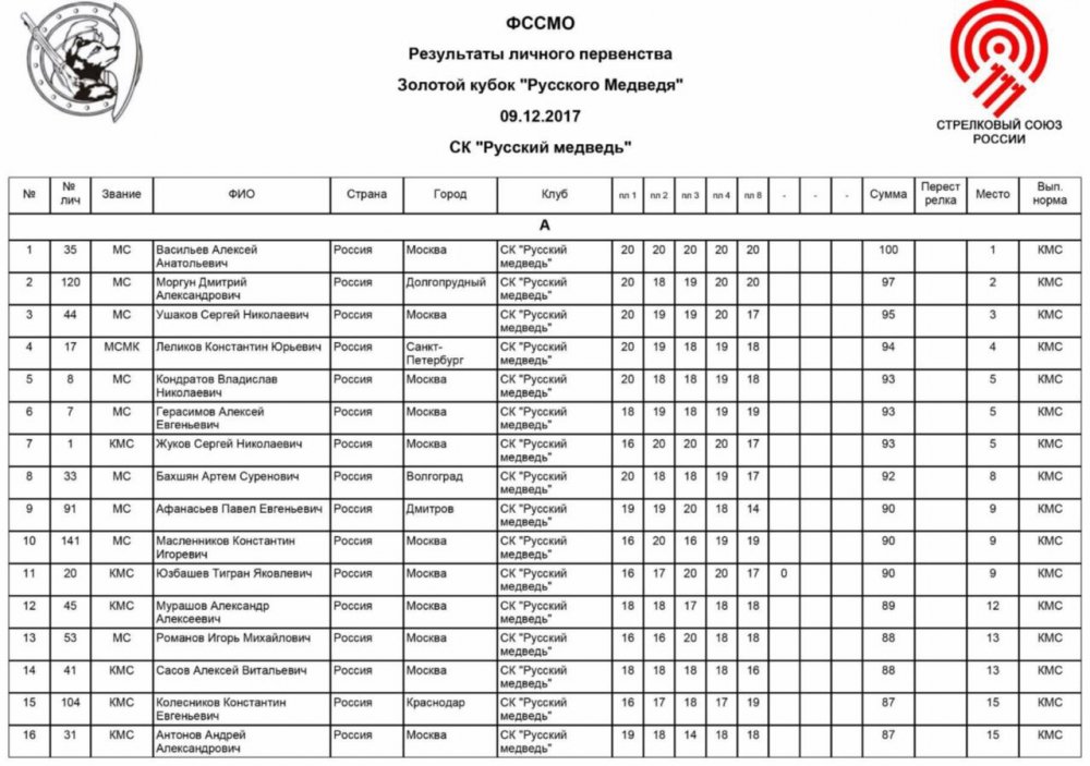 Абсолютную точность продемонстрировал Алексей Васильев на турнире Золотой Кубок «Русский Медведь» по компакт-спортингу, который проходил в Московской области 9 декабря. Поразив 100 мишеней из 100 возможных, стрелок команды МЦ-Феттер (СК Цитадель) поднялся на высшую ступень пьедестала почета, на 3 точных выстрела опередив Дмитрия Моргуна и на 5 – Сергея Ушакова, завершивших соревнование на 2 и 3 местах соответственно.