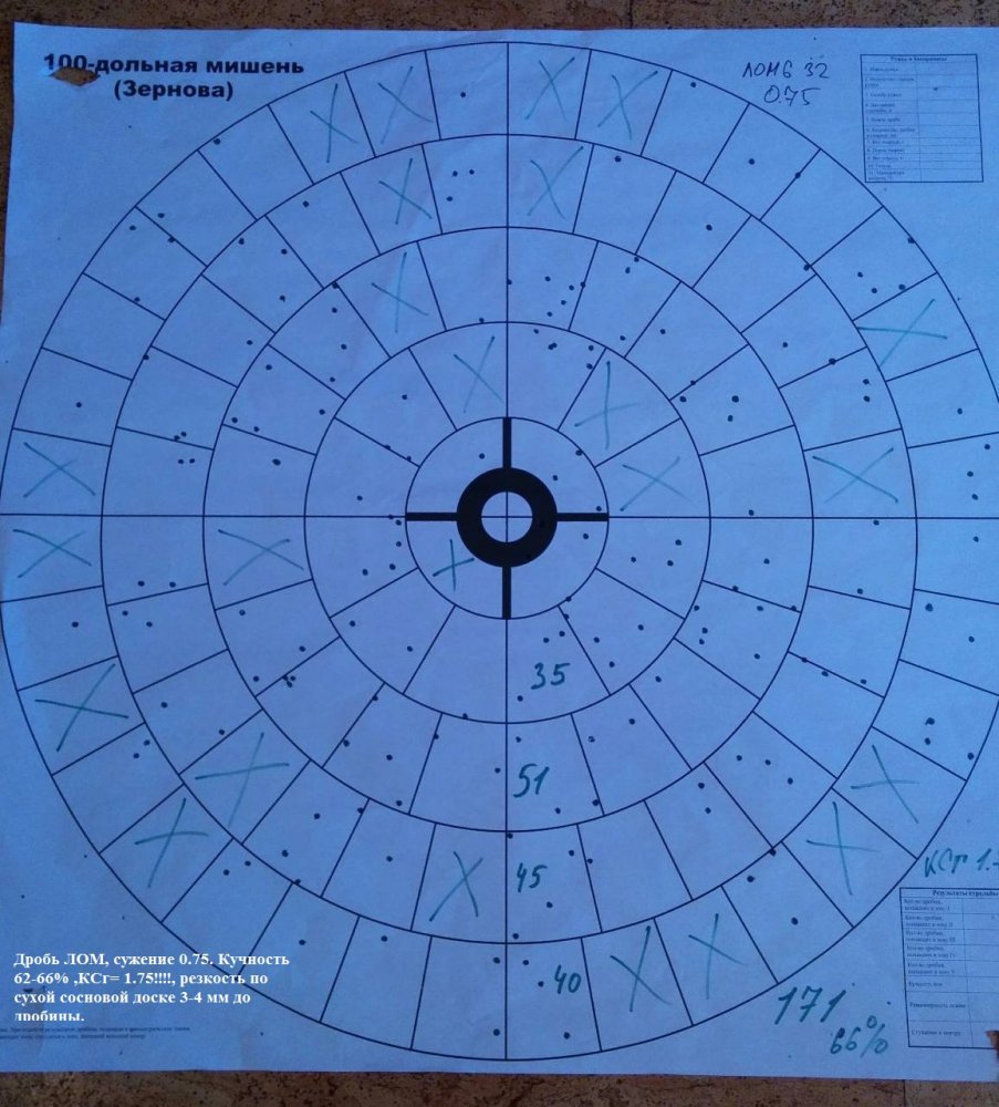 Армсан Фенома, дробь 6-ка ЛОМ, 32гр., д/с 0,5мм и 0,75мм, 35м, п/к Н 21 (ГП), самокрут. Когда патрон подобран более менее, даже мягкая дробь (ЛОМ) показывает вполне рабочие осыпи.