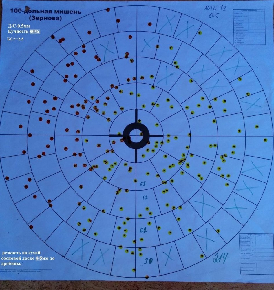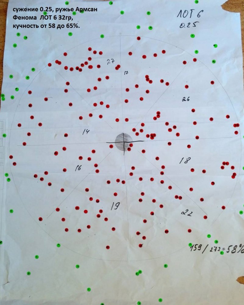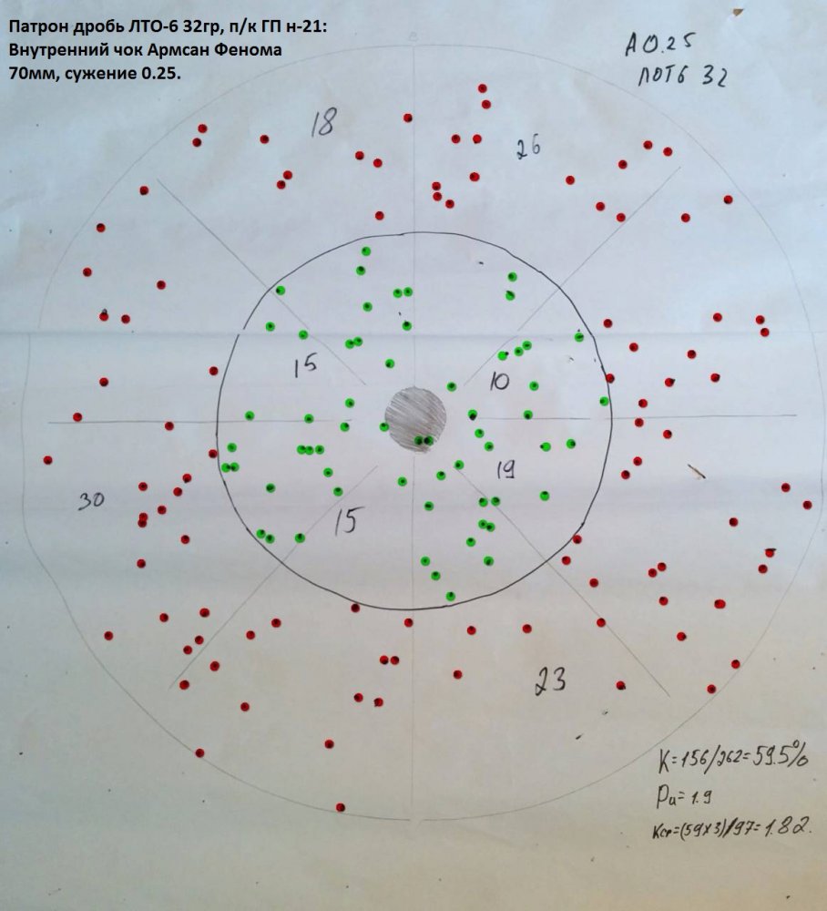 Армсан Фенома, д/с 0,25мм ( родное и Беретта ОСНР), ЛОТ 6-ка, 35м. Как видим Ксг весьма сильно отличается у данных д/с, а ружье одно и тоже, как и патрон. Но с д/с 0.25мм от Армсан Фенома попадать будет довольно сложно до 30м, при Ксг=1,82 и кучности 59%. Родное д/с 0,25мм выполнено с перебором по номиналу: