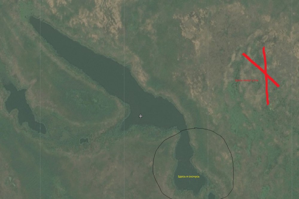 На картинке озеро большое (около 450-500 метров открытой воды). Утке хватает вокруг него мест для отдыха и возможно кормежки, там сплошные заросли тростника, рогоза, залитого водой (в хорошие годы сплошь, в сухие только в низинах). Основное место отдыха уток отмечено крестом. Туда крайне сложно добраться, а уж про охоту и речь не стоит, слишком много зарослей. Вот утка там и прячется. Теперь про само озеро. Конечно утка надлетает и иногда присаживается на открытой акватории, но самое эффективное место пролета - это небольшой тюк в конце озера, там я и охочусь с чучалами.