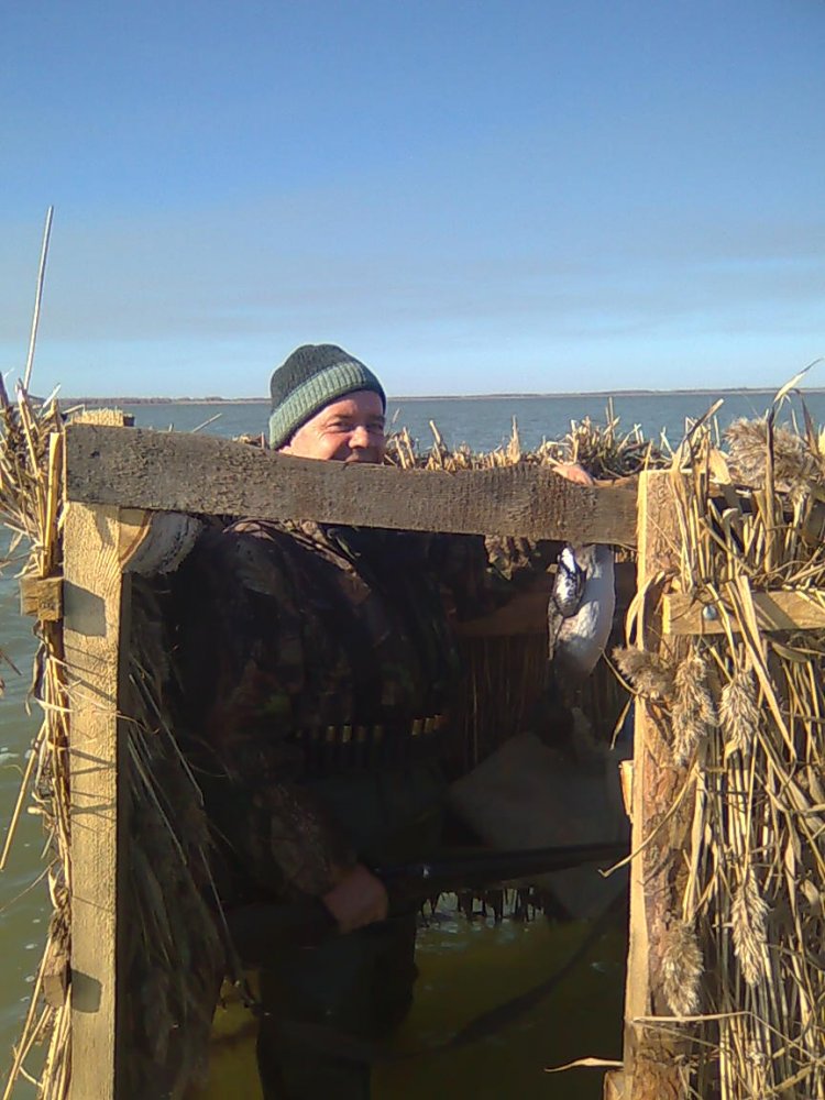 Скрадок посреди воды.Мелкие озера,на таких метров за 70 от берега скрадок ставишь.Стреляешь по кругу скрадка,хорошо видишь что творится в соседних на пару скрадков левее,пару правее.Обычно все стараются такие скрадки делать в линию и очень ругаешься когда кто-то воткнёт впереди .