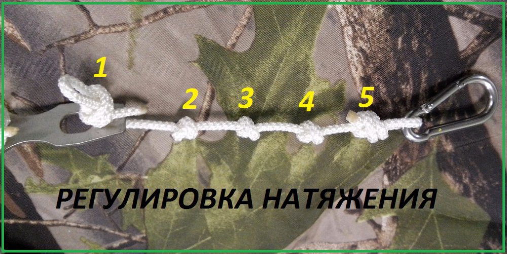 шнур крепится монолитно, через два отверстия, через шнур регулирующий натяжение и карабин пожарный к шнуру от палатки - тента. В случае, если произойдет вырывание колышка из грунта( учитывая его размеры и оснащенность зацепами, маловероятно)он останется на жесткой сцепке с шнуром от палатки - тента. Тем самым, в экстренной ситуации, мы без потери драгоценного времени, можем установить и закрепить наше имущество. А это, сухие вещи, спокойные жены и дети!
