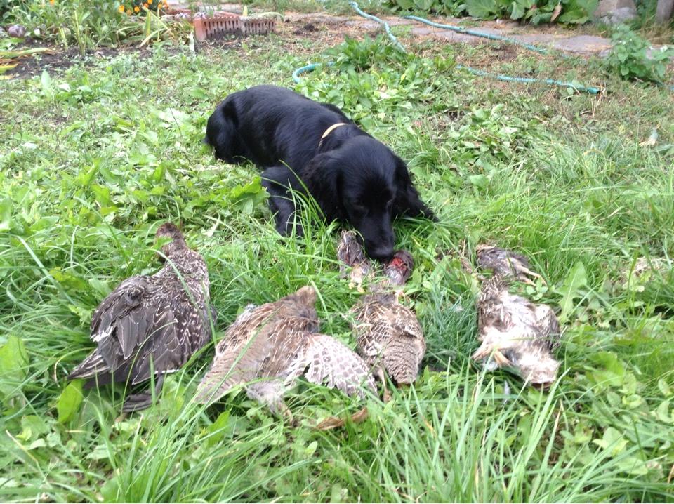 Мы тоже пошли рядом с дачей друга, думали мож пару перепелок найдем, а нашли и куропаток и утю подранка.