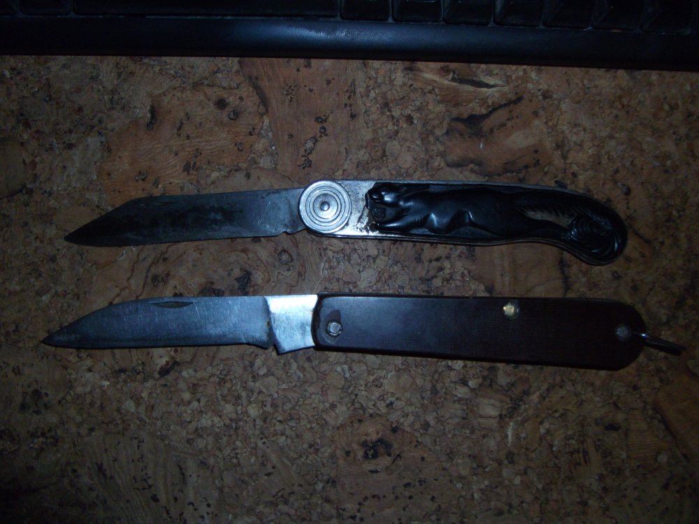 Такой у всех есть. А вот другой мне больше нравиться. Клинок из нержавейки(мягковат конечно, гнётся зато не ржавеет и очень бриткий), спуски от обуха, накладки когда-то были такого-же цвета только с перламутром но, со временем отвалились и когда сломалась пружина решил его восстановить . Приклепал гетинаксовые накладки. Они оказались толще старых и нож стал массивнее что-ли, как-бы тяжелее. Углы накладок не стал закруглять потому-что лёг в руку и понравилось. Выточил новую пружину, в результате изменился угол между лезвием и рукояткой т.е. нож как-бы не полностью раскрывается но, мне так даже больше нравится . На лезвии плохо читаемая маркировка: в ромбе одна или две буквы (похожа на "и" или "м") или цифры а так-же ниже указана цена "Ц 1-00" В своё время подрезал этот складишок у отца и теперь он для меня как память. Может кто знает где эти ножи делали, какой завод выпускал?