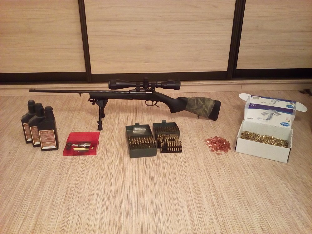 К нему полный набор для релоада: молотковый набор ЛИИ, около 200 гильз, около 200 пуль амах, около 1000 пуль Алекс4х4 (для тренировок), 3 банки пороха, около 200 капсулей квб; переходник для мелкашки от Астарого, около 200 патронов мелкашки (импорт) и пара коробочек для патронов на 100 и 50шт.