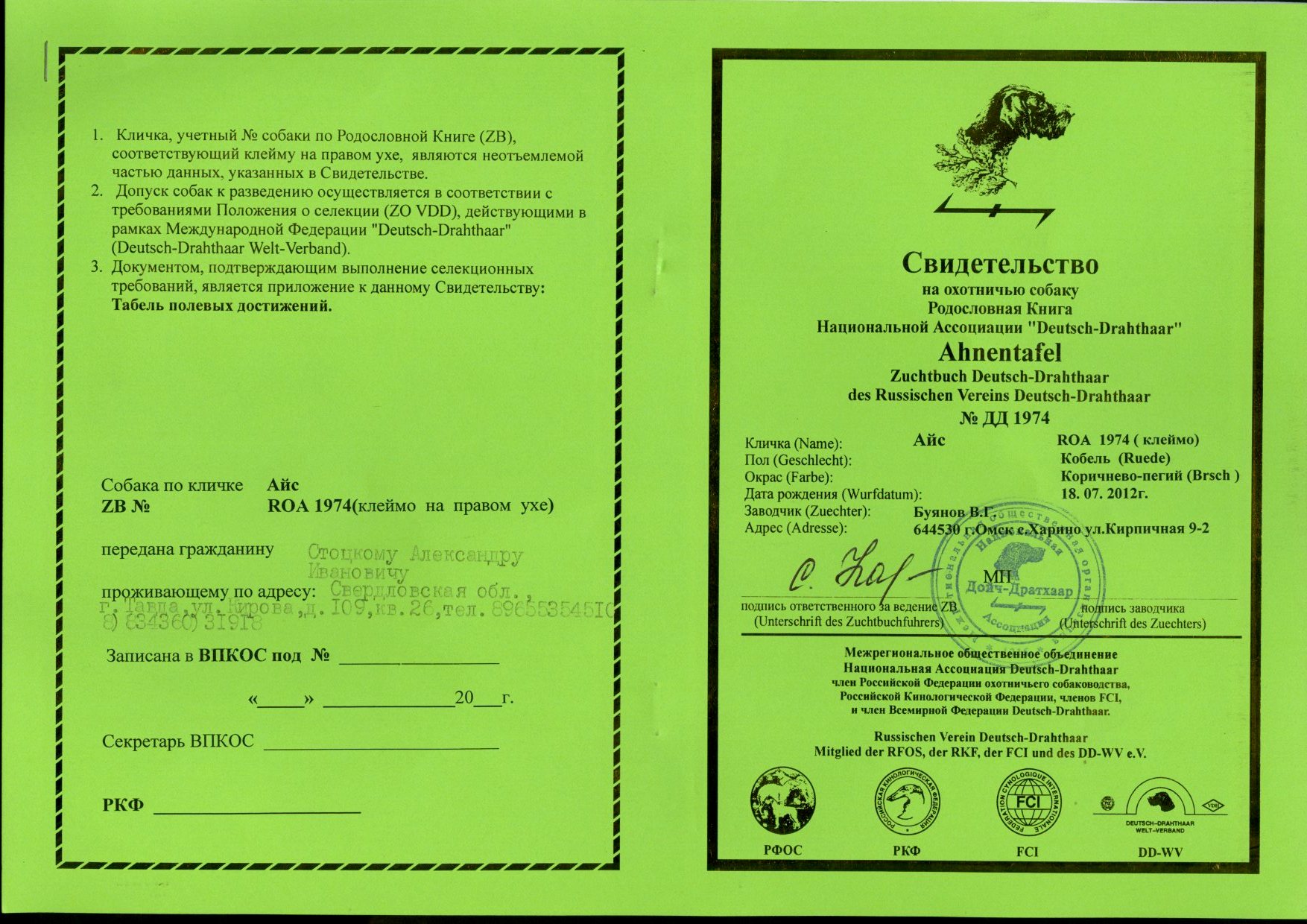 Справки о происхождении охотничьей собаки: №495АЛ-12/0056-2, 3, 4; 5 и 6 соответственно.