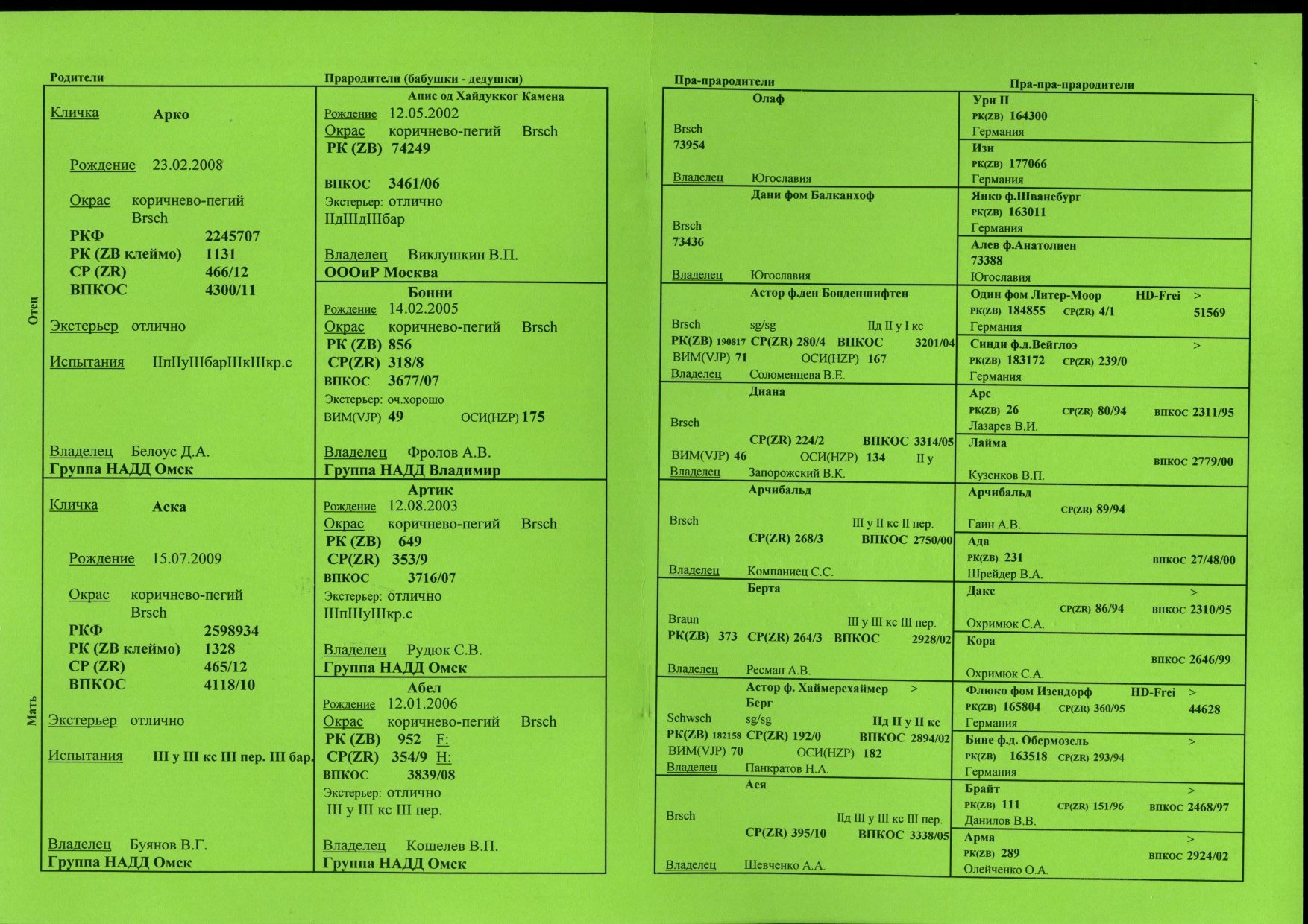 Окрас: рыжий; экстерьер: очень хороший; полевые дипломы: I, II бар; IIб; II, III каб; II бар; III м; III мп. Класс первый.