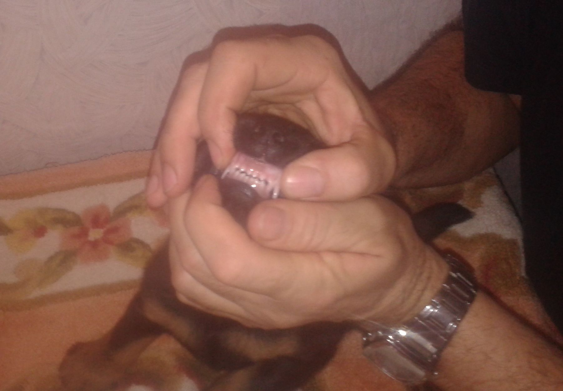 На видео розовая нитка, кобель без нитки и кобель с желтой ниткой