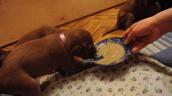 Сегодня щенки первый раз начали есть сами.