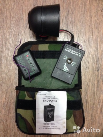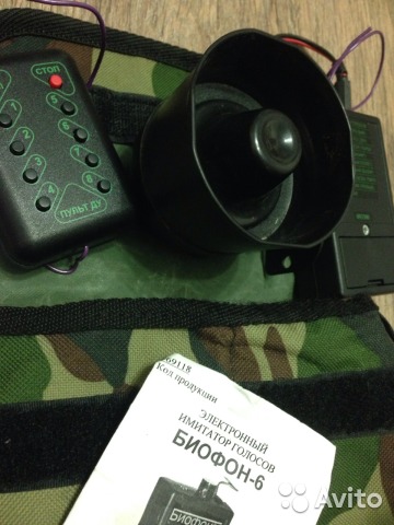 Электронный имитатор голосов "Биофон-6" предназначен для имитации голосов птиц и животных. Воспроизводит голоса: 1. Кряква (призыв). 2. Кряква (осадка). 3. Серый гусь (весенний поиск). 4. Серый гусь (базар). 5. Белолобый гусь (базар). 6. Белолобый гусь (полет). 7. Гуменник (весенний поиск). 8. Гуменник (призыв). 9 . Рябчик . Технические характеристики. Электронный имитатор голосов (ЭИГ): Габаритные размеры 95 мм Х 60 мм Х 40 мм. Вес- 150 грамм. Питание от батареи 9 Вольт (типа Крона ) Емкость чипа памяти - 9 голосов. Возможность смены чипа памяти. Пульт дистанционного управления (ДУ): Габаритные размеры 80 мм Х 60 мм Х 27 мм. Вес- 50 грамм. Дальность действия до 50 метров. Питание от батареи 23 АЕ 12 Вольт лежит без дела . Цена 4500р. т. 8960918931семь