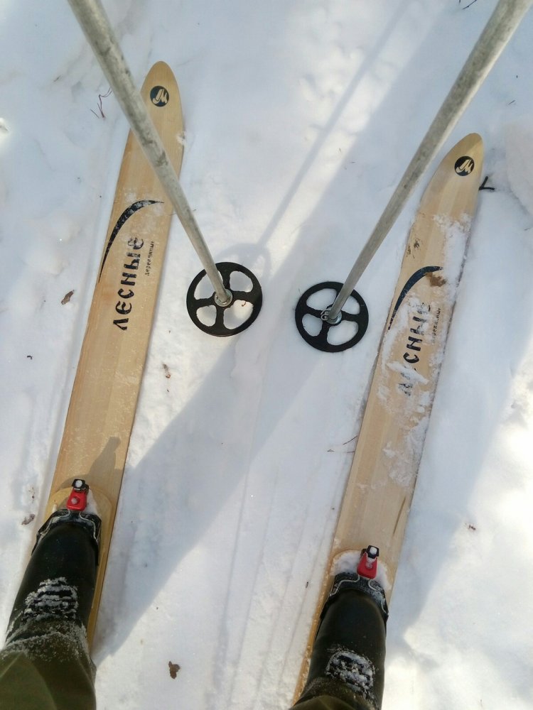 Эти лыжи сделал как раз для уже по лыжне ходить, но они проваливаются меньше чем снегоступы, и идти в них быстрее даже по целине. Вес может и больше, но это мелочи. В рюкзак умещаются, чуть выступая, но носить можно в рюкзаке без проблем. Сегодня в этих лыжах скатывался по крутому склону, по следу снегохода чуть присыпанную снегом, так такую скорость набрал, что приходилось тормозить упираясь в края следа снегохода и все равно пару раз зарылся в снег - палку надо брать, что бы тормозить. Потом опять поднялся вверх не снимая лыж - камус выдюжил подъем, и уже по накатанному проехался вниз, появилась сноровка в маневрировании и хотя скорость была выше, но уже не падал.