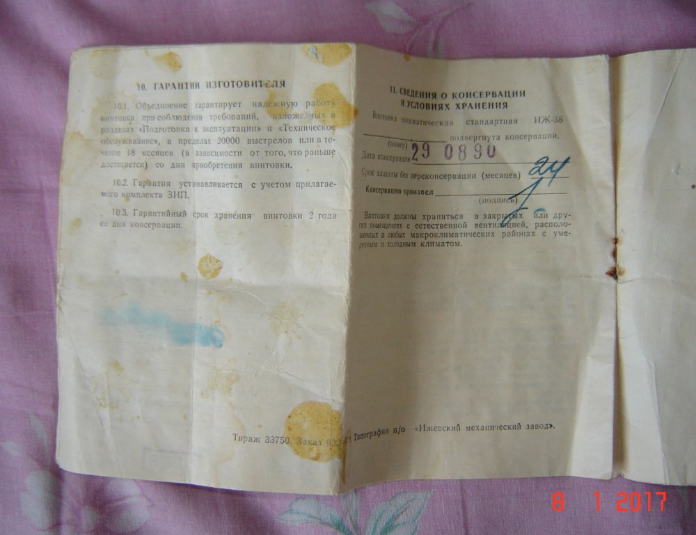 Год выпуска – 1990, состояние – 4. Есть трещины с обеих сторон на ложе, но шата или каких - либо болтаний нет. В комплекте родные: шомпол, пружина, ЗИП, паспорт. Остатки пулек советского же производства. Пружина ни разу не менялась, та, что в комплекте – «новая». Цена 2000р.