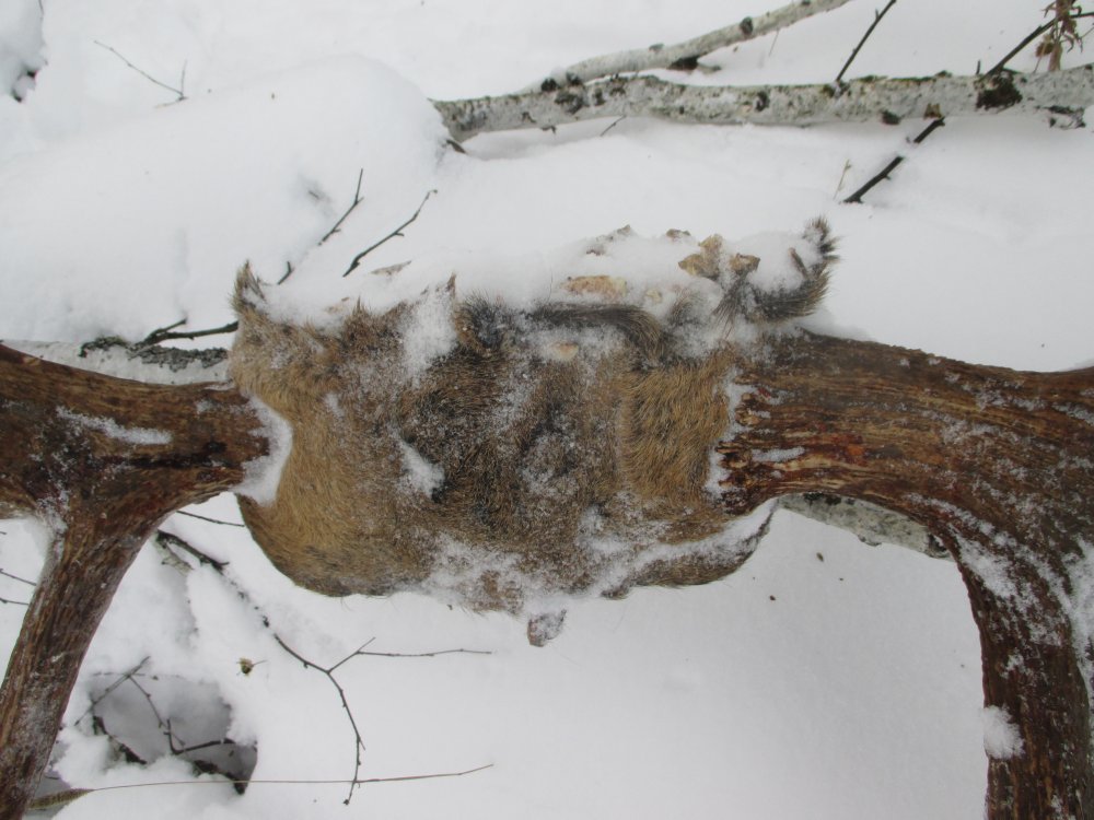 Прикольно у вас лоси рога скидывают,прям с черепом:DДаже интересно почему охотники не забрали такой трофей редкий,или торопились мясо увезти.:D