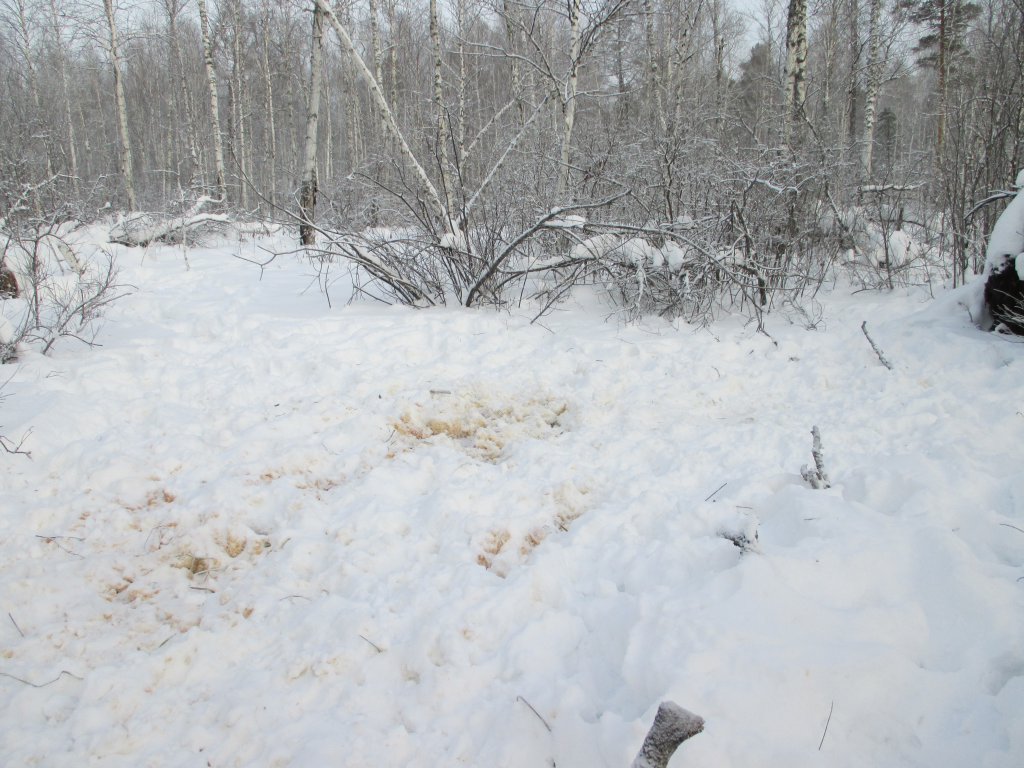 Хоть и перебиваются лоси снежком в зимний период, а водички видимо все же хочется. Кромка болота, снегом присыпало, не промерзло ни где путем, раскопали...подходил когда, смотрю, во, истоптано все, как "гонная яма", зассано все, подошел, нет, "лунки" ржавая болотная вода. Дальше еще увидел такую же картину, но уже рядом с выворотнем.