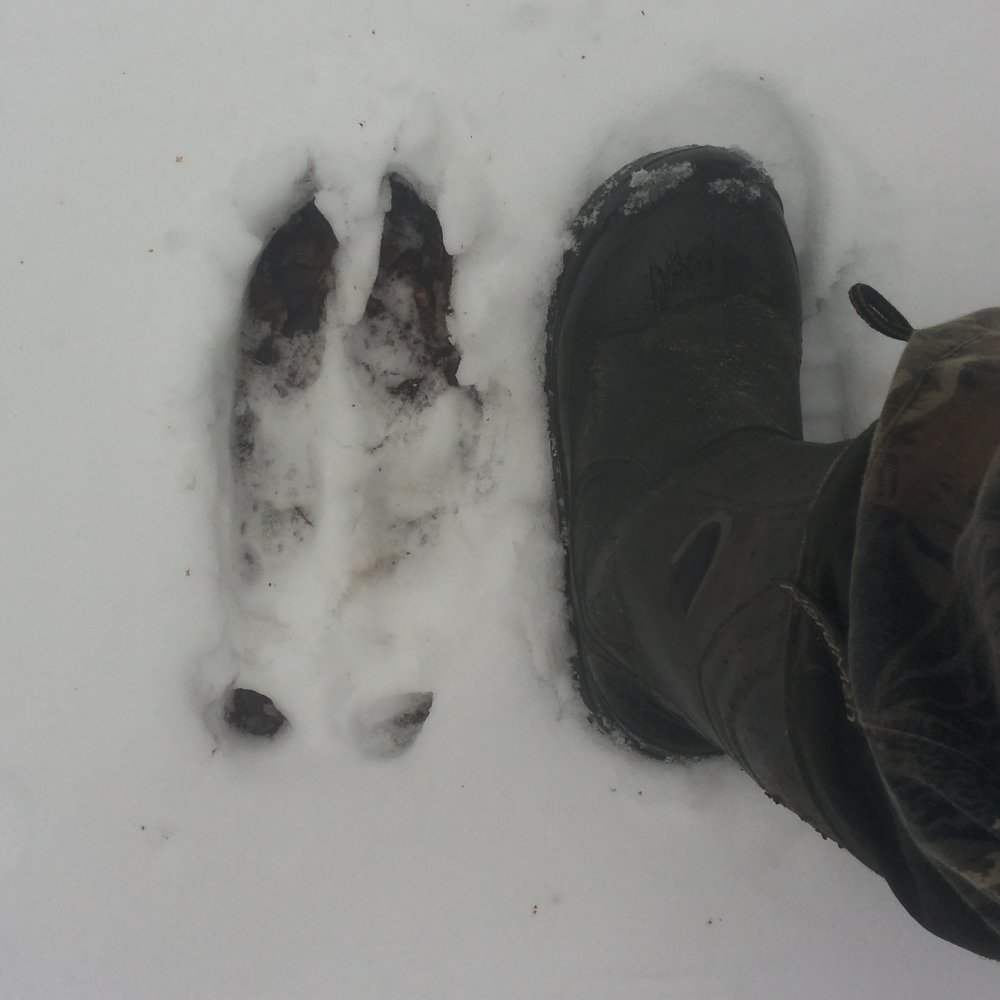 ...след не подтаивший, как говориться почти "горячий"...встречал следы гараздо крупней, ну как следы...какахи...размером с мяч для большого тениса...и лежки его больше двух метров в длину, рулетки конечно небыло, мерил собой ложась в лежку...а копыт не видно было, снег уже глубокий и сухой был...