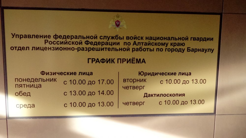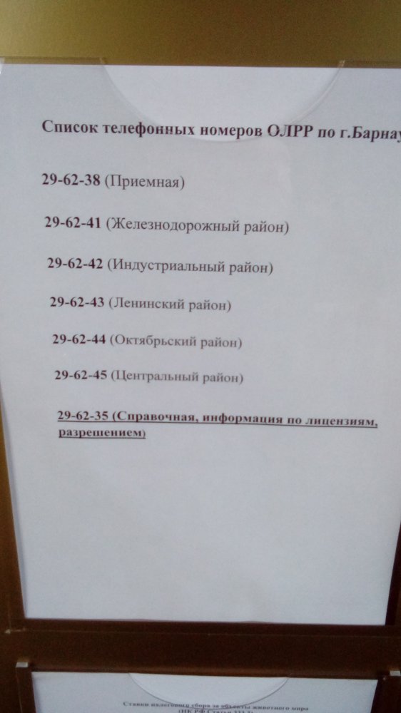 Предлагаю делиться информацией по Барнаулу. Так как недавно прошел процедуру продления РОХи, то и начну. Процедура может изменяться, могут изменяться реквизиты, так что информация актуальна на февраль 2017 г. Всем понятно, что процедура как всегда с перегибами со стороны властей, поэтому сразу предлагаю не флудить на эту тему, пишу как есть на деле, а не как должно быть в идеале. Итак. Отдел ЛРР по гор. Барнаулу находится по адресу: г. Барнаул, ул. Шевченко, 170 График приема граждан: Контактные телефоны по районам: Если предварительно посетить Отдел ЛРР, то услужливая девушка на входе выдает два листочка: 1. Квитанция на оплату госпошлины. Пошлина 10 рублей за одну РОХу. Платил через Сбербанк, взяли 30 рублей комиссии сверху, на терминал в здании ЛРР надежды мало, так как при моем посещении он у них не работал. Лучше заплатить заранее. "Просят" платить отдельными чеками за каждую РОХу, примут ли одним чеком не выяснял. Понятно что это бред, но все же сделал отдельными чеками, переплатив за каждый чек по 30 рублей 2. Список документов для продления РОХи (дословно): ДОКУМЕНТЫ НА ПОЛУЧЕНИЕ (ПРОДЛЕНИЕ, ПЕРЕРЕГИСТРАЦИЮ) ОРУЖИЯ Подача заявлений через единый портал WWW.gosuslugi.ru 1. Медицинская справка формы 002-ОУ по месту жительства (с заключением врачей) + справки от нарколога (г. Барнаул, ул. Толстого, 23); психиатра (г. Барнаул, ул. Луговая, 19), +химико-токсикологическое исследование (г. Барнаул, ул. Толстого, 23); (для лиц имеющих специальное звание (сотрудников органов исполнительной власти) справка с отдела кадров, мед.комиссия не нужна)). 2. Фотография 3х4см - 1 шт. на заявление + по одной на каждую единицу оружия. 3. Ксерокопия паспорта: разворот с основными данными о гражданине + разворот с регистрацией. 4. Акт участкового уполномоченного полиции по месту жительства: прием граждан ежедневно без выходных с 18-00ч. до 21-30 ч. на участковых пунктах полиции (адреса на стенде). 5. Ксерокопия охотничьего билета. Получение охотничьего билета (г. Барнаул, ул. Чкалова, 230) 6. Свидетельство об обучении и акт проверки знаний НОУ (для лиц впервые приобретающих охотничье оружие или оружие самообороны, для лиц имеющих оружие самообороны при продлении: акт проверки знаний, из НОУ за исключением лиц имеющих специальное звание). /// данный пункт мне вычеркнули \\\ 7. Контрольный отстрел для нарезного оружия (при продлении разрешений и продаже оружия). Запись предварительная по т....... /// данный пункт мне вычеркнули \\\ 8. Ксерокопии имеющихся разрешений и лицензий на оружие. 9. Квитанция об оплате бланков разрешений или лицензии. Разрешения на неисправное оружие не выдается. Предоставление оружия обязательно! На каждый вид оружия отдельный пакет документов. Обращение за 1 месяц до окончания срока действия разрешения, (при наличии). Еще некоторые тонкости из полученного опыта записи на прием через ГОСУСЛУГИ. 1. При попытки записаться лично на прием, без регистрации заявления в портале Госуслуг, предлагается выбрать подразделение, в итоге в списке лишь в Центр лицензионно-разрешительной работы Управления Росгвардии по Алтайскому краю, что находится на ул. 10я Западная, 1а. Туда нам не зачем, так что приходится регистрировать заявление, в котором два этапа сначала выбираем Центр ЛРР Управления Росгвардии по АК, затем ваш районный отдел. 2. При регистрации заявления кроме своих персональных данных требует