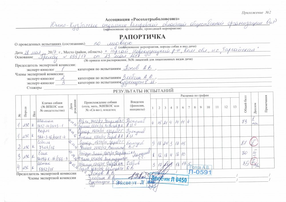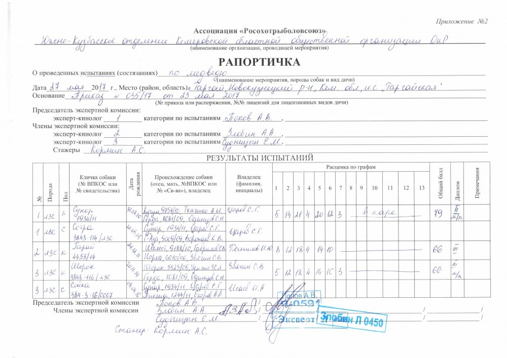Дорогие друзья, предлагаю вашему вниманию официальные рапортички с прошедших 27-28 мая испытаний по медведю проводимых в г. Новокузнецке.