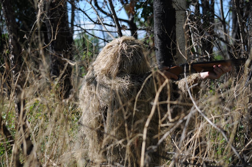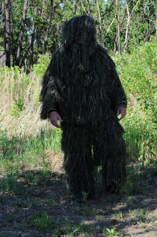 Маскировочный костюм "Леший" сделан из прочных синтетических материалов, легок, стоек к выцветанию, старению, не намокает, сам материал не 'шуршит', не имеет запаха, при солнечной погоде не дает бликов. Костюм хорошо камуфлирует фигуру человека, как в горизонтальном, так и в вертикальном положении. Костюм выполнен из сетчатой ткани с нашитой бахромой. Верхняя часть костюма застегивается на пуговицы, нижняя часть на утягивающем поясе, накидка на голову крепится на веревки под подбородком и имеет сетку закрывающее лицо.
