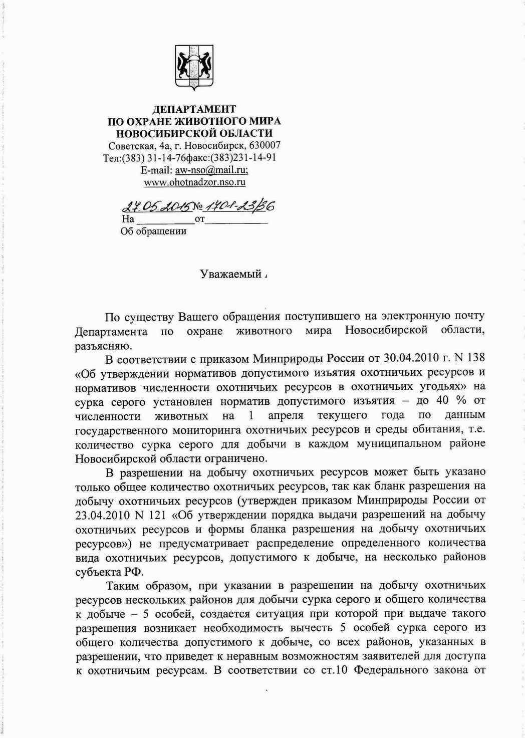 Отправил 13.05.2015 вечером, на следующий день получил по электронной почте подтверждение: (с) " Здравствуйте! Ваше письмо с темой «Заявление, для рассмотрения и ответа», отправленное Среда, 13 мая 2015, 18:36 +06:00, было прочитано получателем Департамент по охране животного мира НСО <aw-nso@mail.ru> Четверг, 14 мая 2015, 9:04 +06:00. С уважением, Почта@Mail.Ru