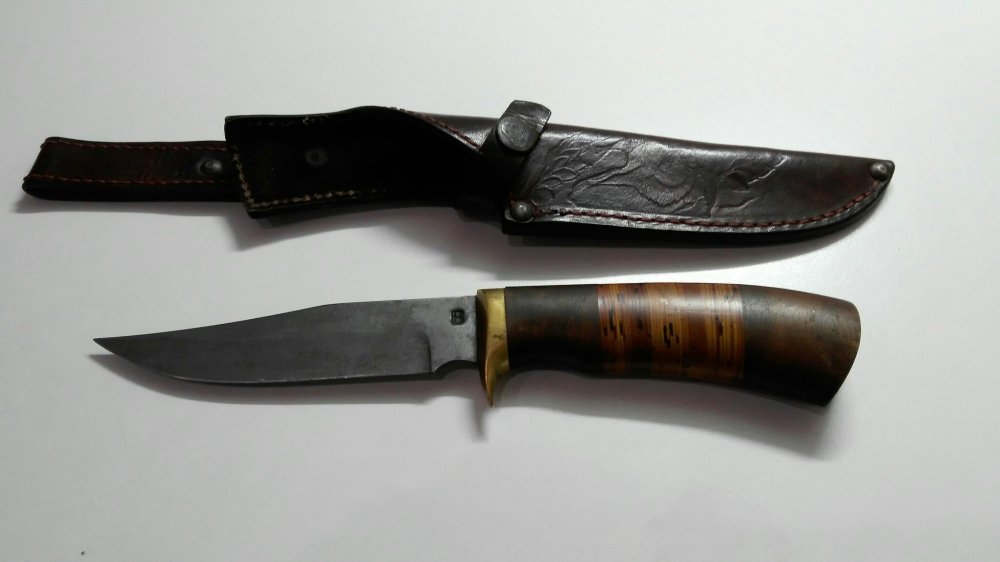 3) Нож оружейных мастеров г.Ворсма из дамасской стали, рукоять орех-береста , с оригинальными ножнами. Клинок работал несколько сезонов выездов на природу, отлично себя проявил. Размер 130х28х2.6.
