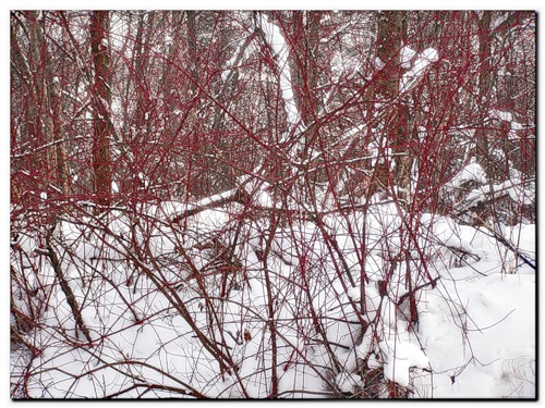 Это большая забока в пойме Оби, с полоинами и сильно поросшая подлеском типа краснотал,черемуха или ежевика, но самое неприятное это хвощ. Снегу по пояс, а внизу пустота, лыжи не держат. Со всех лугов снег сюда забило. И все таки капкан какого номера пойдет на рысь.