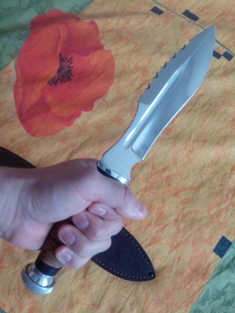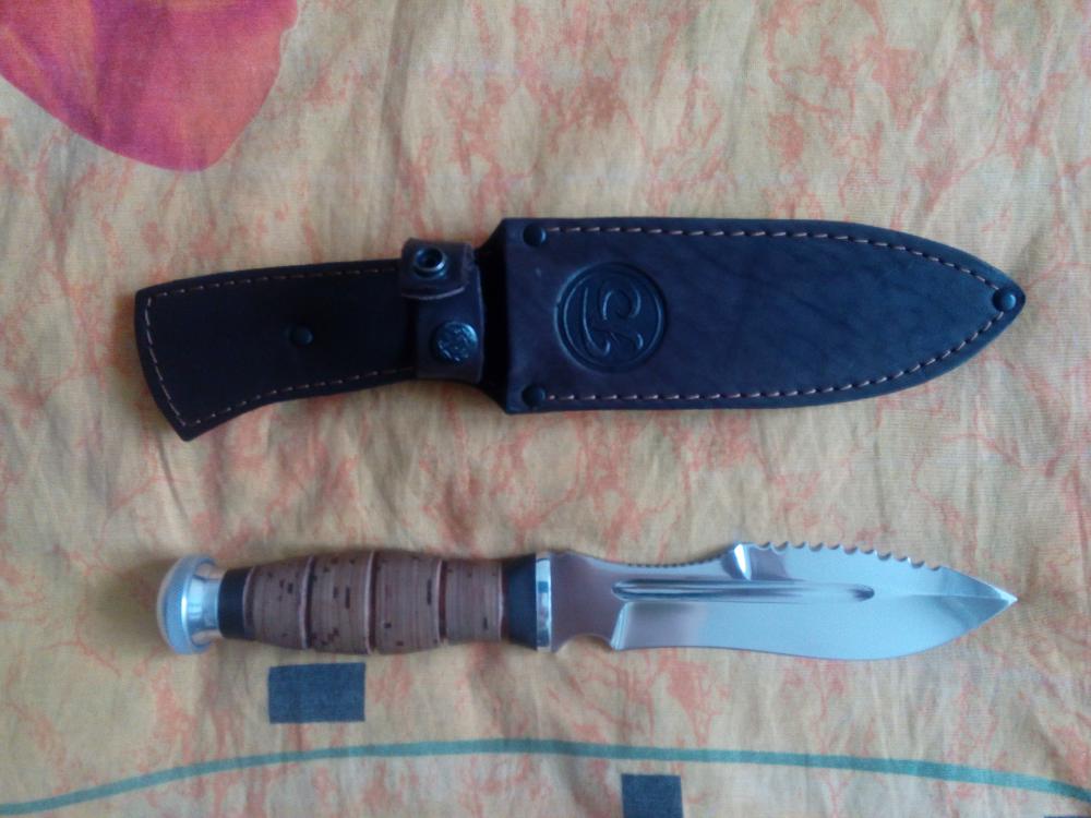 Нож "Барс" (новый) Марка стали клинка: Сталь 95х18 Длина ножа (мм): 270 - 320 Длина клинка (мм): 155 - 180 Длина рукояти (мм): 115-135 Наибольшая ширина клинка (мм): 35-45 Толщина обуха (мм): 3.0-6.5 Твердость стали: 58 Материал рукояти: береста Материал ножен: кожа Страна изготовитель: Россия Сертификат соответствия-не является оружием. Нож предназначен для грубых работ. Достаточно увесистый. В руке сидит как влитой. Наколоть небольшие щепки, или срубить небольшое деревце, без проблем. Для походов в лес самое то. Как мини топор справляется со своими задачами на раз. Цена- 4300 руб. Торг.
