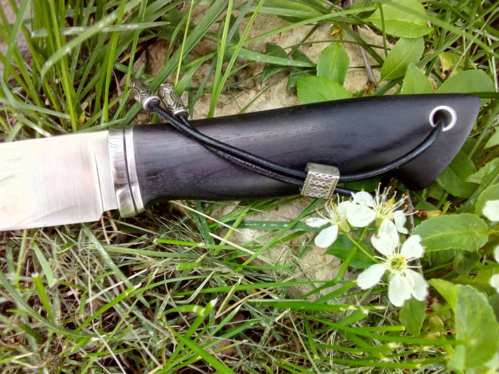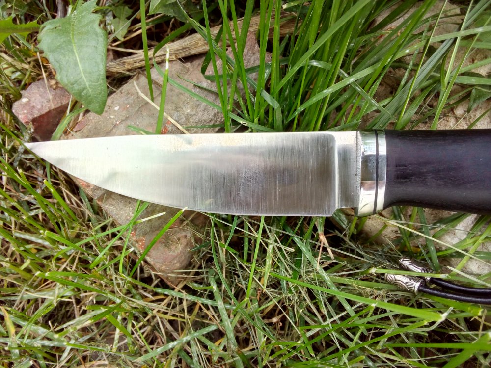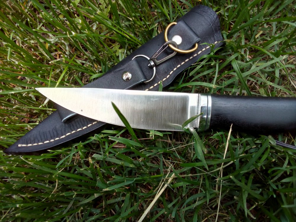 Сталь Элмакс, Т.О. Буров С. твердость 61-62ед. 125х30х3,8 . Спуски от прямые обуха. Сведение 0,3 мм , кончик - 1мм. Финиш - сатин. Рукоять черный граб , пропитанный в датском масле 12 см. Отверстие под темляк. Больстер нержавейка , проставки нержавейка и кожа.Ножны кожа, воск.Темляк нат. кожа 6000 руб. с доставкой ELMAX – хромо-молибден-ванадиевая порошковая сталь производства компании Uddelholn (Австрия). Благодаря новейшим разработкам порошковой металлургии эта сталь имеет карбиды небольших размеров, что способствует очень эффективному резу. Сталь обладает великолепными прочностными характеристиками, высокойкоррозионной стойкостью и отлично держит заточку.