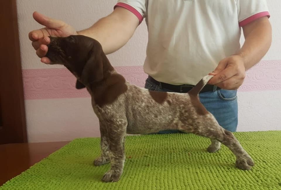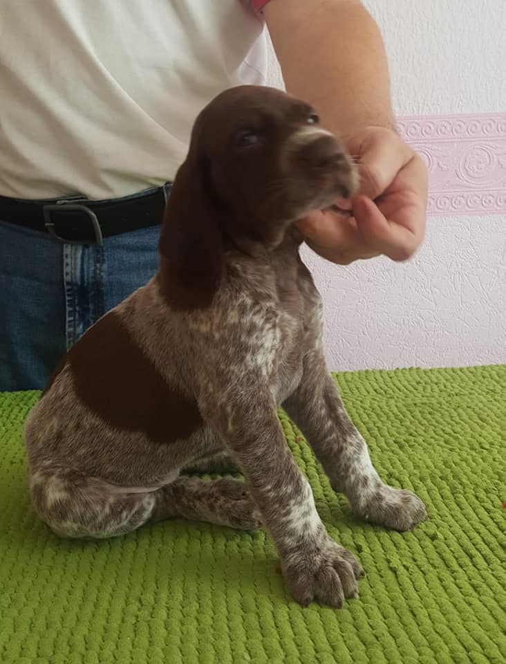 Отец щенка - молодой еще курцхаар, Ufo. Рожден 19 марта 2016 года. Вывезен из Италии в Украину. Имеет Д2 по куропатке и экстерьер отлично.
