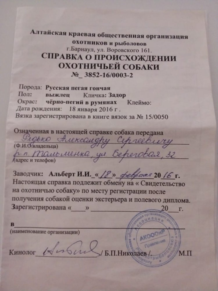 В связи с переездом товарищ продает выжлеца РПГ, выжлец подойдет только для охоты и все, у него проблемы с прикусом. Фото выжлеца и доков попробую выложить позже. По информации к владельцу собаки тел- 89835464233. Зовут Александр. Цена вроде бы говорил 10.000т. Находится Алт- Край рп.Тальменка.
