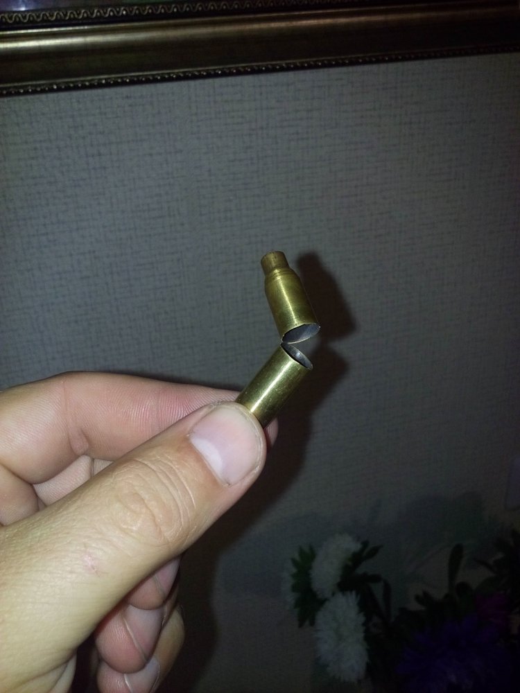 тоже такая имеется... причина банальна- поперечная царапина при неаккуратном снятии фаски не лучшим инструментом. металл поплыл, царапина увеличилась и на 2-3 разе треснула. но на твоей фотке конкретно так капсуль расплющеный