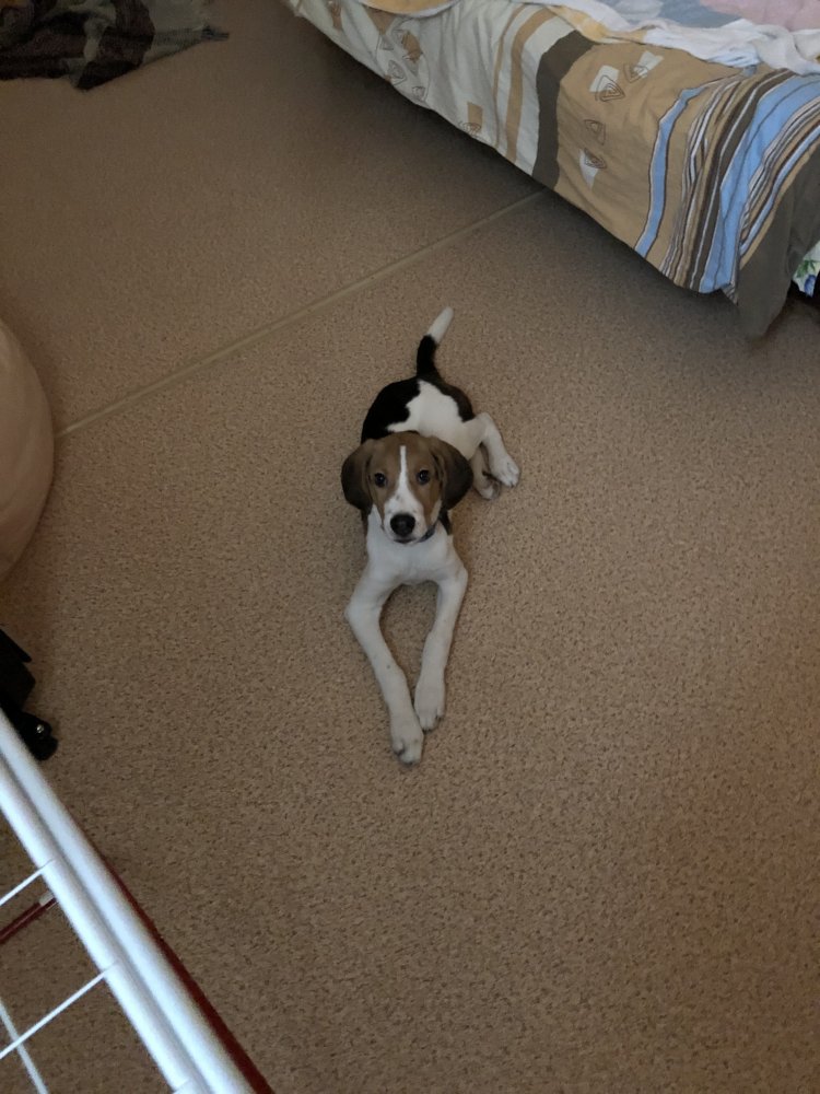 Отдам щенка русской пегой! Есть паспорт, прививки все сделаны. День рождения 18 июня.