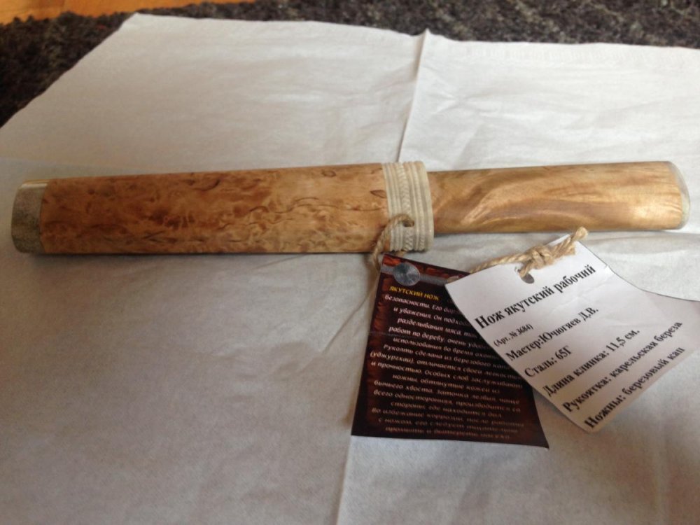 Продаю нож якутский рабочий, новый, не использовался. Куплен в Якутске. Мастер: Ючюгяев Д.В. Сталь: 65Г Длина клинка: 11,5 см Рукоятка: карельская береза береза, рог Ножны: березовый кап, рог Цена: 12500 р. (Москва) Если есть другие предложения - пишите. Тел. 8-919-962-60-22