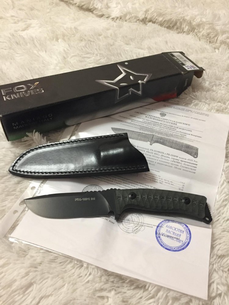 родаю нож Fox FX-131 MGT абсолютно новый (Москва) есть сертификат соответствия, коробка и ножны (кожаные с креплением на ремне). Цена: 9000 р. Если есть другие предложения - пишите. Тел. 8-919-962-60-22 Вес (г): 210; Длина (мм): 230; Материал рукоятки: микарта; Длина лезвия (мм): 110; Материал лезвия: сталь; Тип основного лезвия: гладкое; Конструкция: нескладной; Тип: EDC / походный
