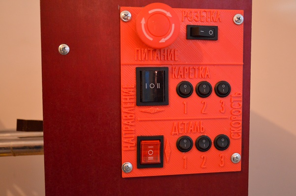 Станок имеет три скорости движения каретки и три скорости вращения детали. Движение каретки и вращение детали осуществляют моторредукторы на 12 вольт для этого установлен блок питания на 12 вольт.