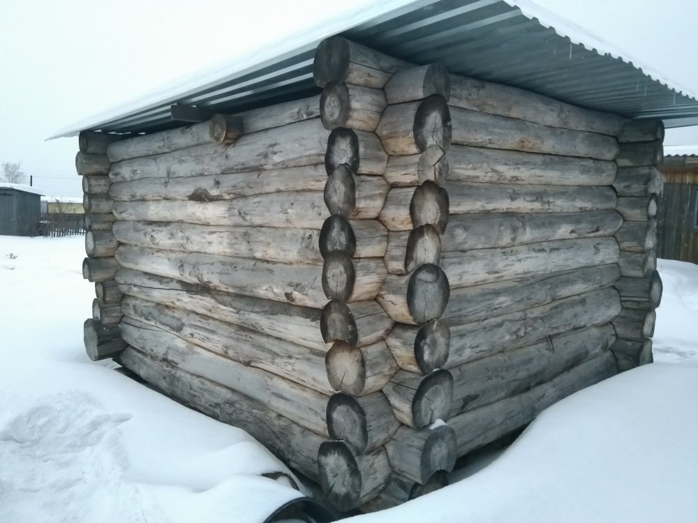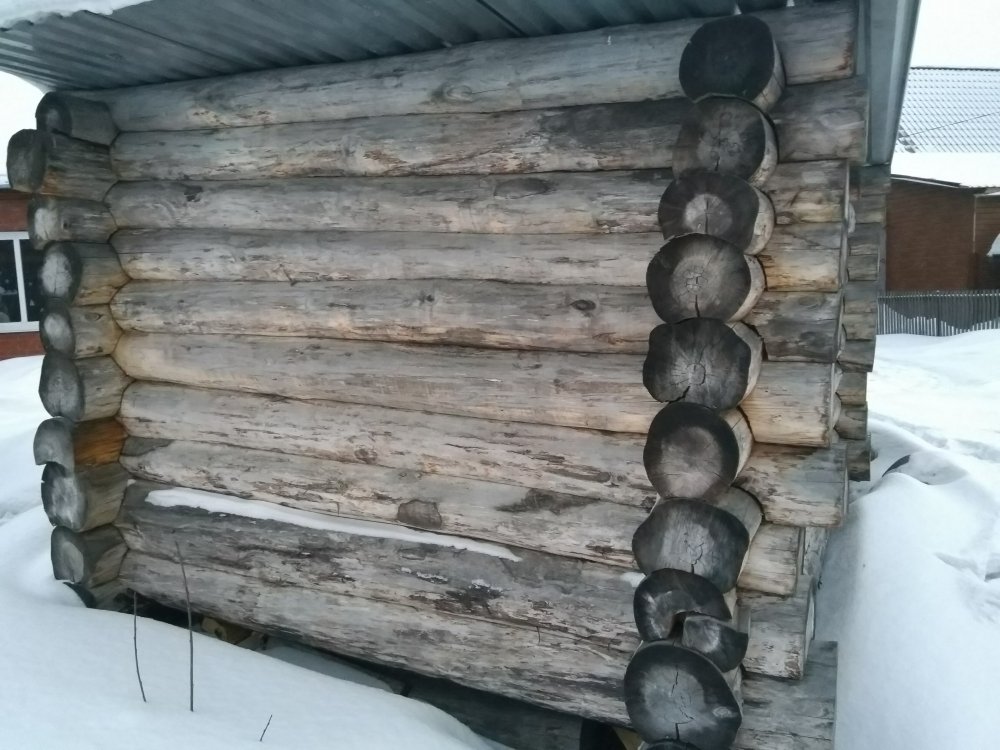 Сруб из морёной осины! т.е. Брёвна лежали год штабелем не ошкуренные чтобы они смогли просохнуть равномерно и не растрескался наружний слой бревна. 2 года стоит под крышей на чурках по углам. Мох для сборки отдам в подарок. Диаметр брёвен от 42см до 22см 60тр. т. 923-24О-ОО55
