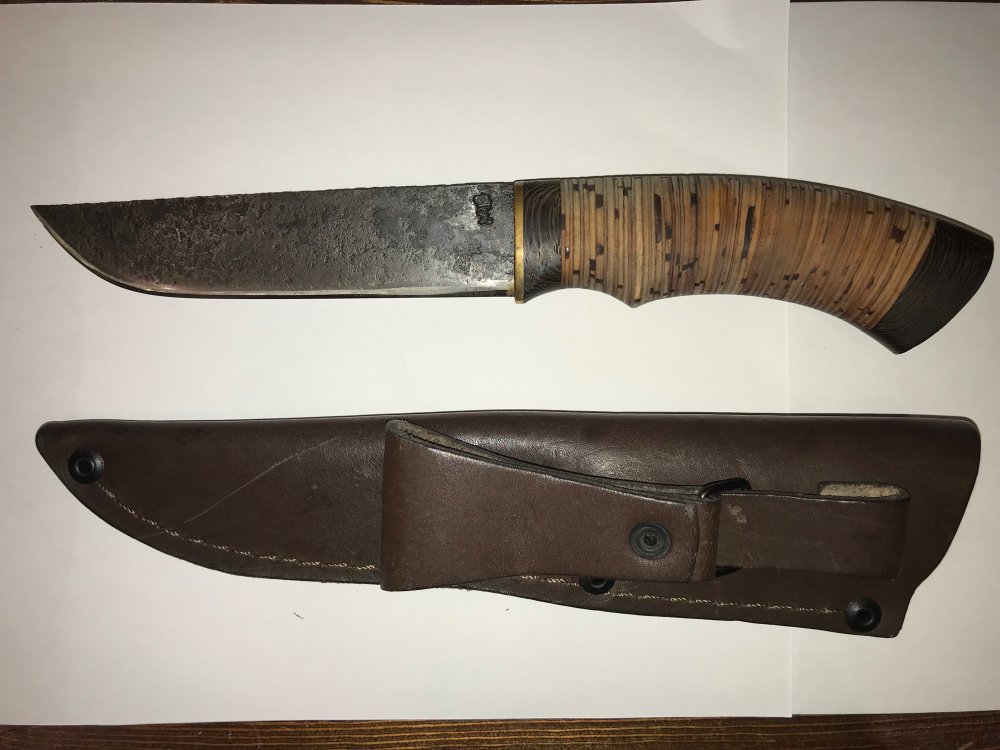 Охотничий нож "Грибник-3", ручная ковка, клинок сталь 9ХС, рукоять береста. Производство РУССКИЙ БУЛАТ. Цена 10000
