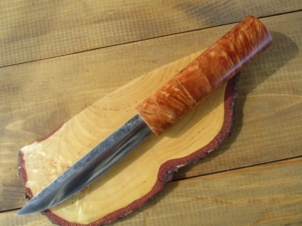 НОЖ № 1 ЦПМ-3В.Термичка Бурчитая.Длинна клина-115мм.Ширина-29мм,толщина в обухе-4мм.Сведён в 0.3.Финиш-сатин Р600.На ручке-рябиновый кап соственноручнодобытый.Длинна ручки-130мм по обуху.Кап был очень интересный-как солнышко-в середине почти чёрный,по краям-светлый,целиком конечно не влез-но постарался выбрать кусок на котором видно побольше интересного.На капе присутствует немного трещин-но на мой взгляд они его не портят.Цена 8000 с моей отправкой. DSC08137.JPG DSC08142.JPG DSC08147.JPG DSC08165.JPG IMG_0014.JPG