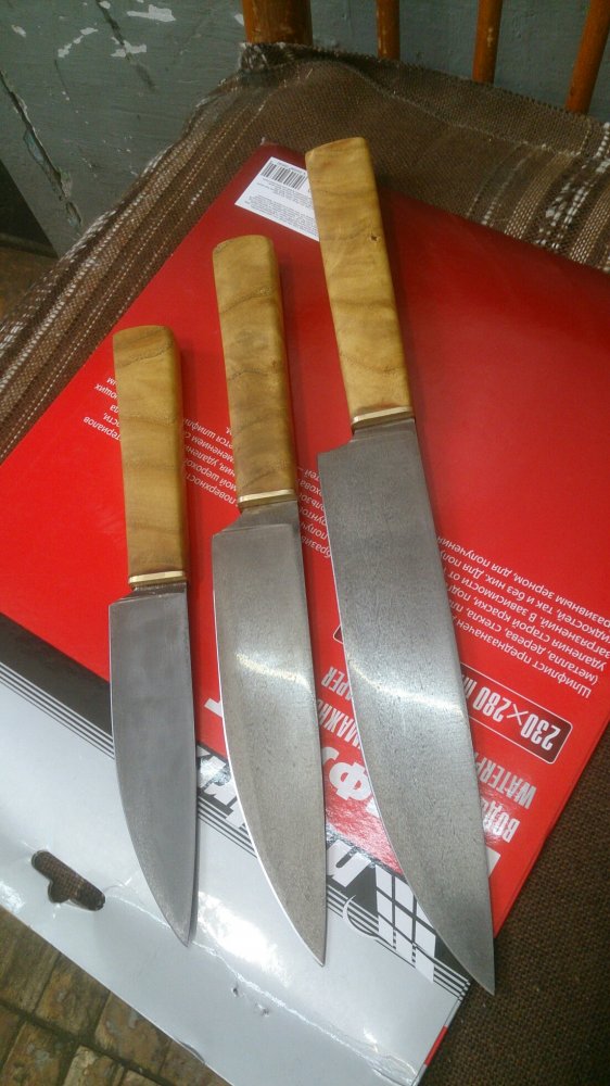 Продам кухонный набор, сталь большого ниолокс, клин 200-40-3, средний д 2 клин 160 -35-3. Маленький n 690, 120 -30-2,5, рукояти шелковица, больстры бронза, цена 10000 плюс пересыл, всем добра! Телефон 89122830551 Алексей.