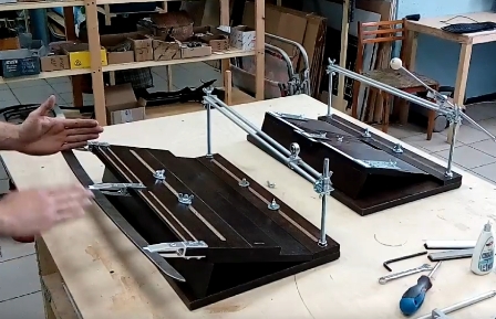 Много лет назад на ганзе шло серьезное обсуждение одного ньюанса, относительно апексоподобных заточных станков. Суть сводилась к тому, что угол заточки меняется на меньший, от середины станка к краям клинка. Для кого-то это считалось отклонением и недостатком, хотя это было не критично на обычных клинках, потому как погрешность была ничтожно мала и не влияла на рабочие характиристики. Предлагались различные варианты, как этого избежать. На первых двух фото, как раз есть решение, но цена не всем по карману.