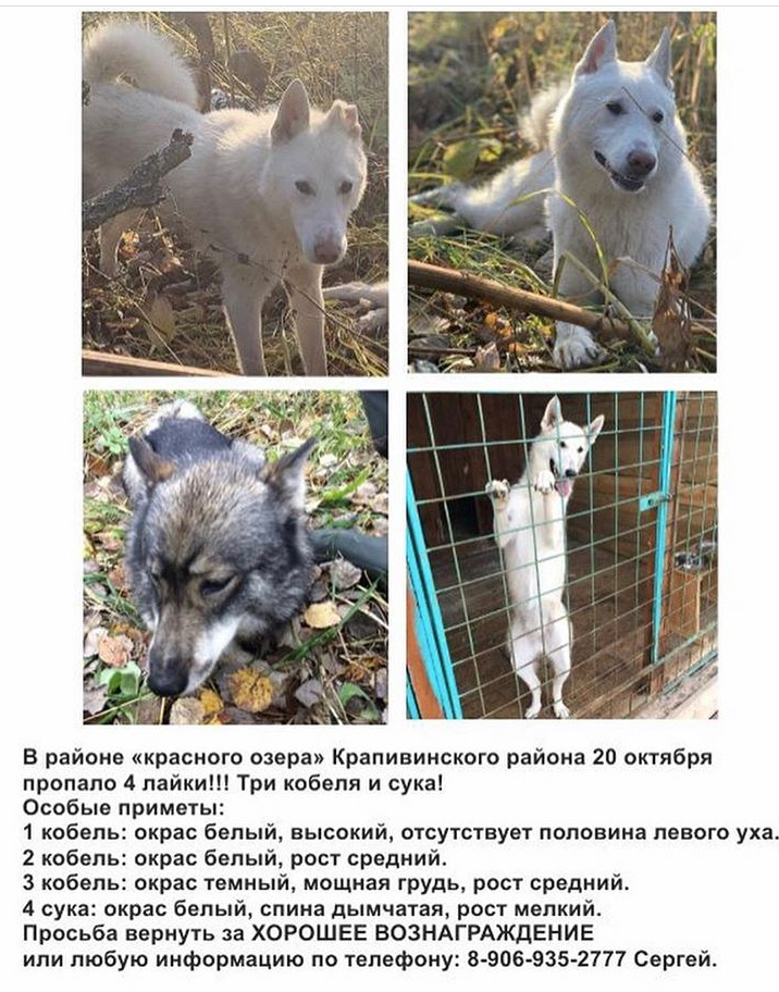 Пропали четыре лайки в районе Красного озера, Крапивинского района, Кемеровской области.
