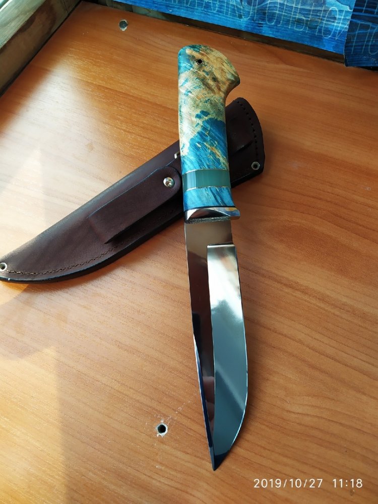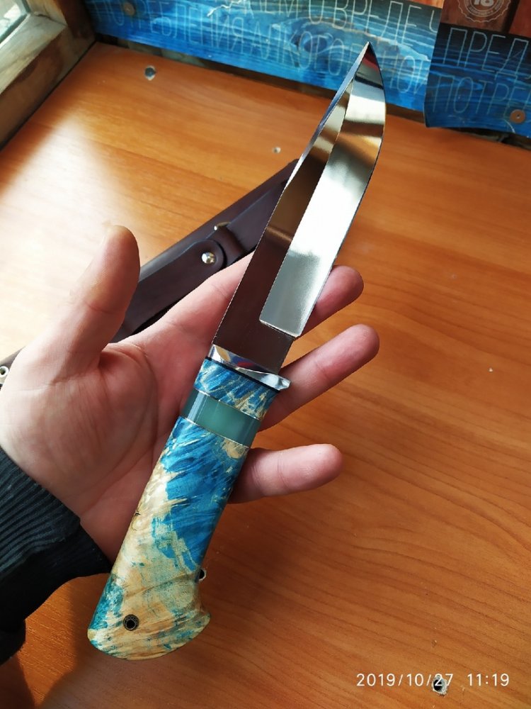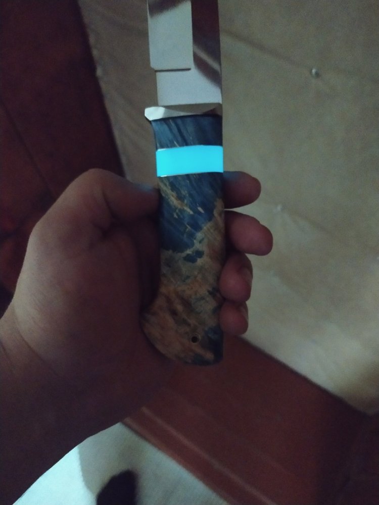 Кованая х12мф 160/33/3,6 Рукоять 130 мм стабилизированый кап клёна от вас больстер нержавейка проставки g10, нейзильбер, вставка из полиэфирной смолы с люминифоровым прошком светиться в темноте вставлен пин ножны кожа всадные двойной подвес. Цена 4,5₽ пересыл на мне. тел. конт. 8913...