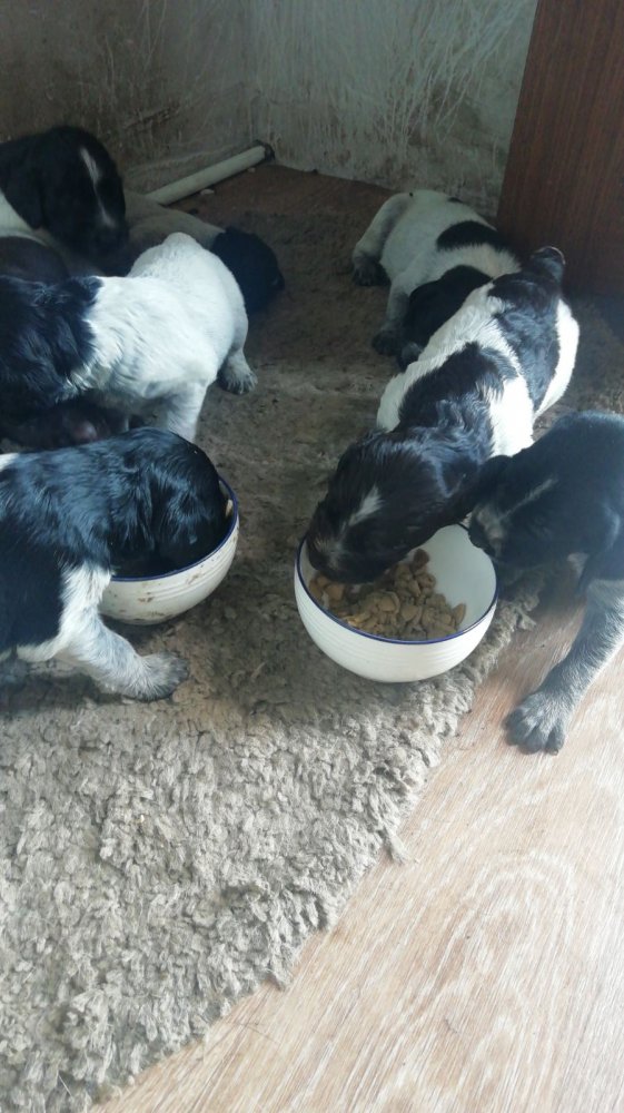 Начали прикорм. Свободна одна черно-пегая сука и 3 кобеля (1 кофейно-пегий, 2 черно-пегие).