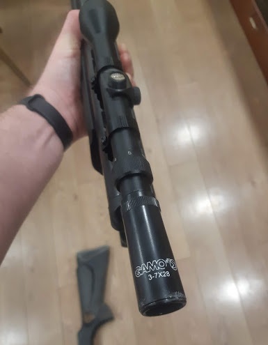 Продам пневматическую винтовку Hatsan 125 с оптическим прицелом. Винтовка с ослабленной пружиной (вторая пружина идет в комплекте). Брал для стрельбы в огороде и поэтому не добрался до замены. Оптический прицел Gamo 3-7x28. На прицеле есть царапины. Приклад у винтовки сломан в следствие падения (на фотки видно). Цена 8000 р. тел. 8-923-411-9079