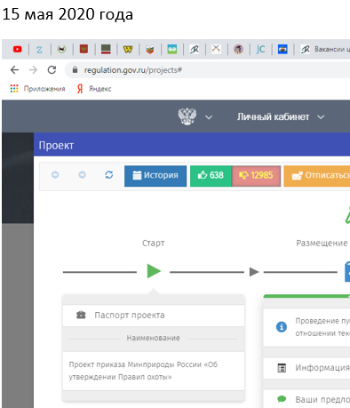 Отправляю Вам скрины настоящего голосования в реальном времени по проекту новых правил охоты при общественном обсуждении на государственном портале: https://regulation.gov.ru/projects# с 8 мая 2020 года по 18 мая 2020 года! До окончания обсуждения и голосования остается примерно сутки, ситуация складывается таким образом на момент последнего скрина: «За» 1470 человек проект в данной редакции и «Против» 15886 человек! За одни сутки кардинально ситуация скорее всего не поменяется по самим результатам голосования! На порталы охотничьи скрины предоставил! Убедительно просим руководство Минприроды в лице руководителя Д.Н.Кобылкина от лица большинства охотников, которые смогли поучаствовать в общественном обсуждении, принять во внимание наши замечания и предложения по изменению данной редакции проекта правил охоты в лучшую сторону (исходя из ситуации сегодня: данная редакция проекта положительно отражает интересы лишь 10% участников обсуждения, и на 90% участников может оказать отрицательные (негативные) последствия в случае принятия данной редакции в предложенном виде от Минприроды РФ без изменений)