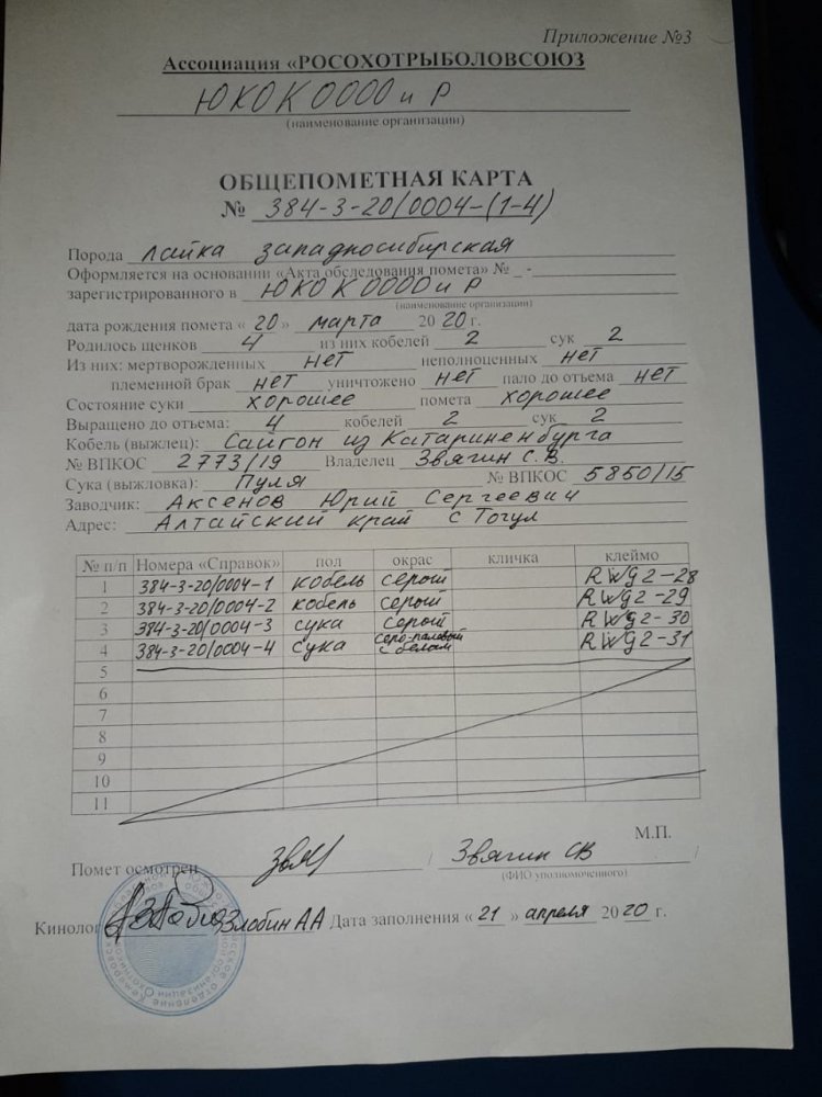 1) Порода ЗСЛ 2) Количество щенков - 4 ( 2 кобеля, 2 суки ). В продаже кобель и две суки. 3) Дата рождения 20 марта 2020 года. 4) Окрас - кобели и одна сука - серые и одна - сука серая с белым. 5) Родители щенков: отец Сайгон, ВПКОС 2173/19, окрас серый, дата рождения 07.06.2014 , оценка экстерьера отл, дипломы: III к, племенной класс 2, владелец Звягин С.В. мать Пуля, ВПКОС 5850/15, окрас серый, дата рождения 03.03.2013, оценка экстерьера отл, дипломы III к, II к/п, III м/п, III б/в, III к/п, племенной класс 1, владелец Аксенов Ю.С. 6) Собаки, вязка, общепометная карта зарегистрированы в Южно-Кузбасском отделении общества охотников и рыболовов. 7) Щенки находятся в селе Тогул Алтайского края. Телефон 89619810910. 9) 15000 руб. 10) Мать щенков Пуля на охоте обладает широким поиском, хорошей вязкостью, отличным компасом. Из под неё регулярно добывается барсук, лось. При её помощи добыты медведи, кабан.