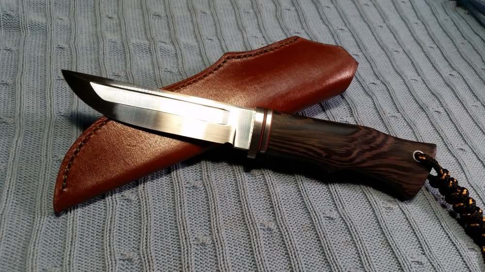 Нож Каракал, сталь 95х18 сталь не ржавеет и долго держит заточку. Размер 120х28х3,8 рукоять 12 см. венге пропитан в датском масле. Больстер нержавейка. Проставки нержавейка, фибра. Ножны свободный подвес, натуральная кожа. Твердость по Роквеллу 59 ЕД. Кожаные ножны , обработанные итальянской аппретурой, свободный подвес( толщина кожи 3,8 , прошитые вощенной нитью ,швы обработаны итальянской краской для урезов).Отправка в любой город России. 3500 + пересыл.